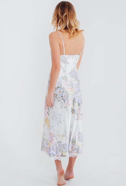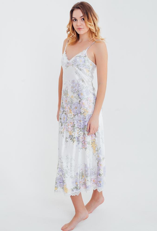 Длинная женская ночнушка из коллекции Lilianna от Mia-Mia. Ночнушка выполнена из смесовой ткани на основе натурального шелка кремового цвета в нежный цветочный принт, на тонких регулируемых бретелях, лиф подрезной, полуприлегающего силуэта. Низ модели и разрез сбоку украшен нежным белым кружевом. Ночнушка очень красивая и комфортная, идеально подчеркнет вечерний женский образ, будет отличным подарком для любимой женщины.