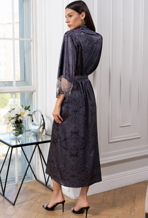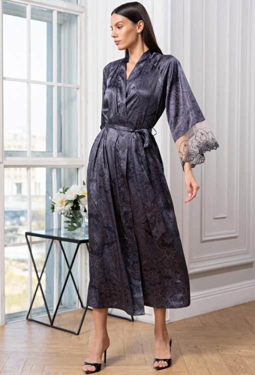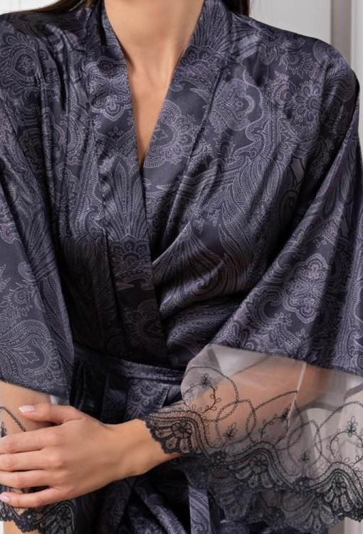 Шикарный женский халат из коллекции Aletta от итальянского бренда Mia-Amore. Халат выполнен из смесового полотна на основе натурального шелка, графитового цвета с восточным принтом серого цвета, свободного силуэта и длиной ниже колен. Модель с рукавами 7/8 и удобными боковыми карманами, завязывается на запах с помощью пояса. Рукава изделия украшены широкими вставками из кружева. Халат очень красивый и комфортный, идеальный для домашнего пользования и отличный вариант для подарка!