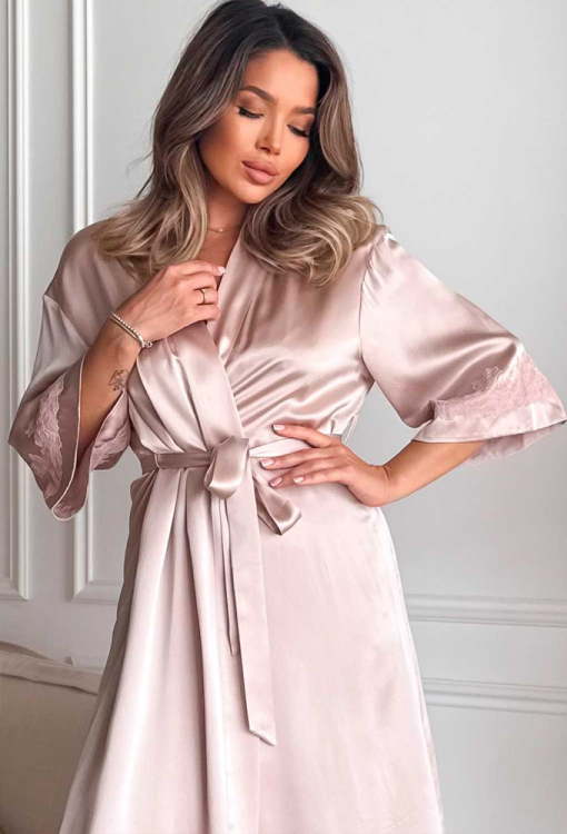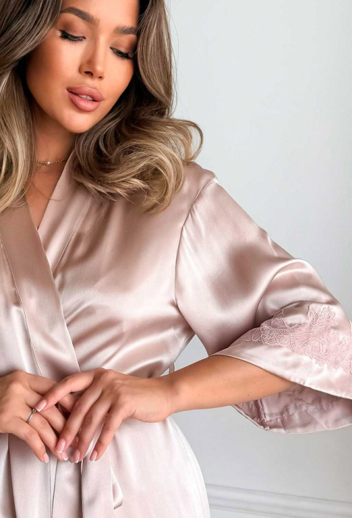 Шикарный женский халат из коллекции Dzhajpur от украинского бренда Silk Kiss. Халат выполнен из мягкого и качественного натурального шелка пудрового цвета, свободного силуэта и длиной немного ниже колен. Модель с рукавами 3/4 завязывается на запах с помощью пояса, рукава украшены кружевными аппликациями. Халат очень красивый и комфортный, подчеркнет женственность домашнего образа и подарит приятные ощущения на теле. Изделие упаковано в фирменную коробку - прекрасный подарок для любимых и близких людей!