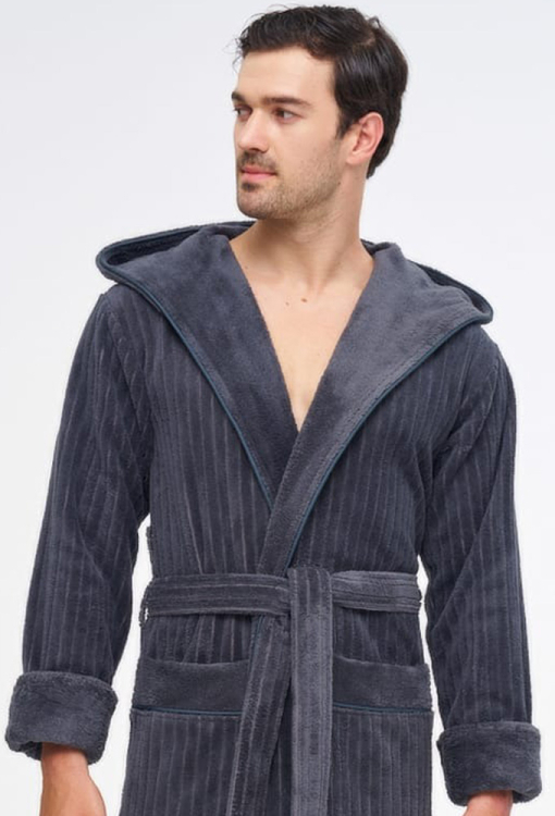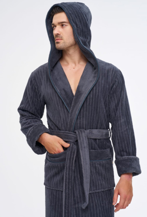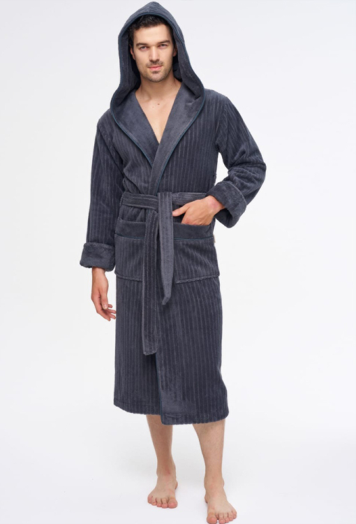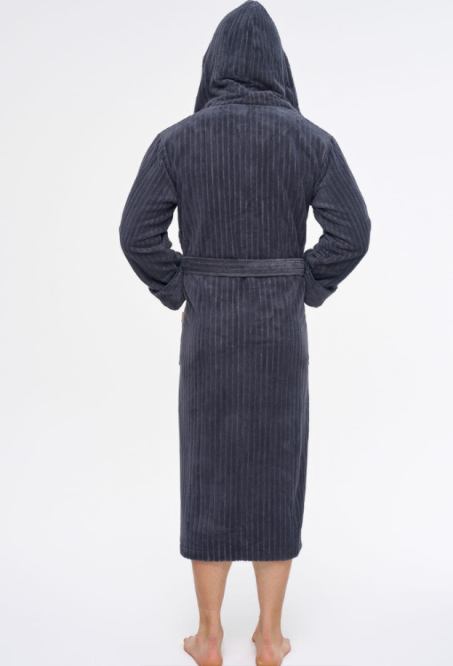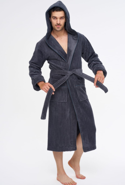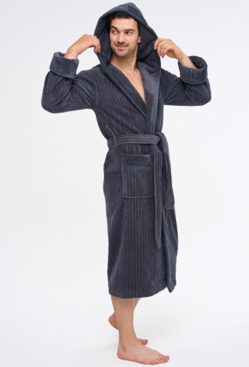 Оригинальный мужской халат от турецкого бренда Nusa. Халат выполнен из мягкого и качественного материала графитового цвета, снаружи велюровый с полосатой фактурой и махровый внутри, с длинными рукавами на отложных манжетах и капюшоном. Модель с удобными накладными карманами и длиной ниже колен, завязывается на запах с помощью пояса. Внутренняя сторона капюшона и манжеты изделия выполнены из гладкой махры, карманы украшены такими же вставками. Халат очень красивый и комфортный, приятно согревает тело и позволяет расслабиться после трудового дня, идеален для подарка близкому человеку.