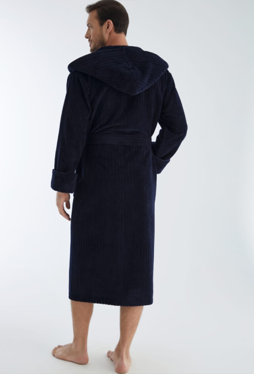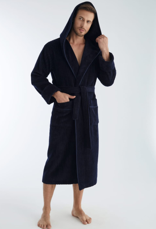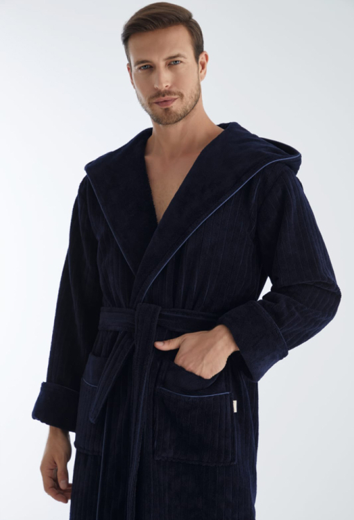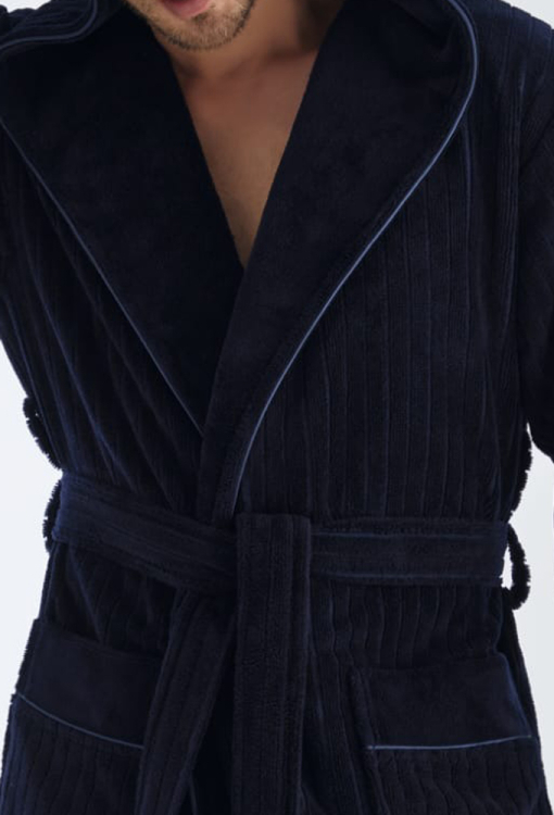 Оригинальный мужской халат от турецкого бренда Nusa. Халат выполнен из мягкого и качественного материала темно-синего цвета, снаружи велюровый с полосатой фактурой и махровый внутри, с длинными рукавами на отложных манжетах и капюшоном. Модель с удобными накладными карманами и длиной ниже колен, завязывается на запах с помощью пояса. Внутренняя сторона капюшона и манжеты изделия выполнены из гладкой махры, карманы украшены такими же вставками. Халат очень красивый и комфортный, приятно согревает тело и позволяет расслабиться после трудового дня, идеален для подарка близкому человеку.