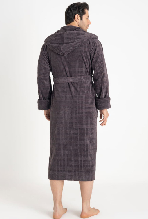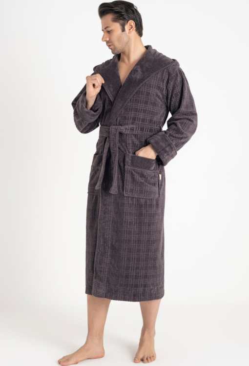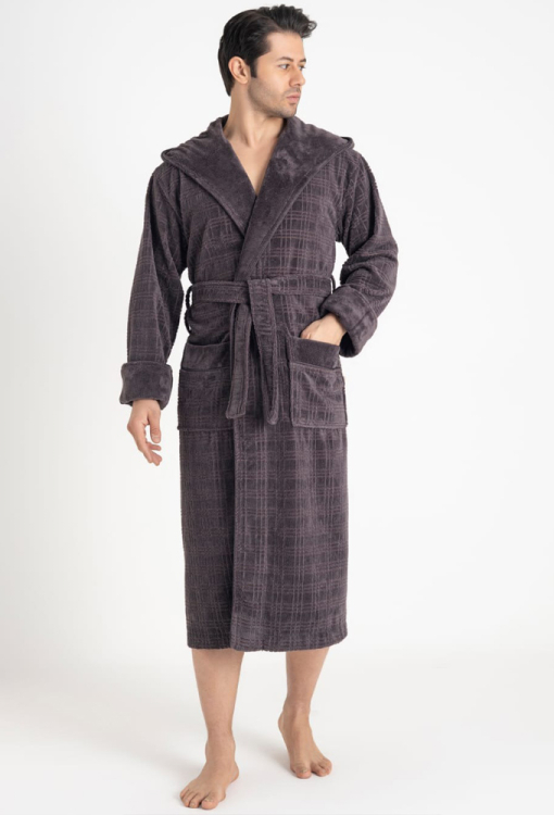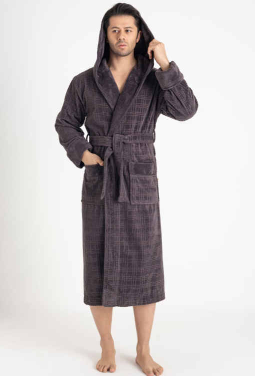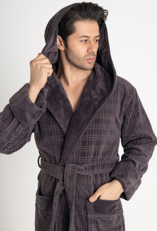 Стильный мужской халат от турецкого бренда Nusa. Халат выполнен из мягкого и качественного материала темно-серого цвета, велюровый с тисненой клетчатой фактурой снаружи и махровый внутри, с длинными рукавами на отложных манжетах и капюшоном. Модель с удобными накладными карманами и длиной ниже колен, завязывается на запах с помощью пояса. Внутренняя сторона капюшона и манжеты изделия выполнены из однотонной гладкой ткани, карманы украшены такими же вставками. Халат очень красивый и приятный к телу, отлично впитывает влагу и позволяет телу дышать, идеален после ванной, бассейна или тренажерного зала, а также может быть полезным подарком любимому и близкому человеку.