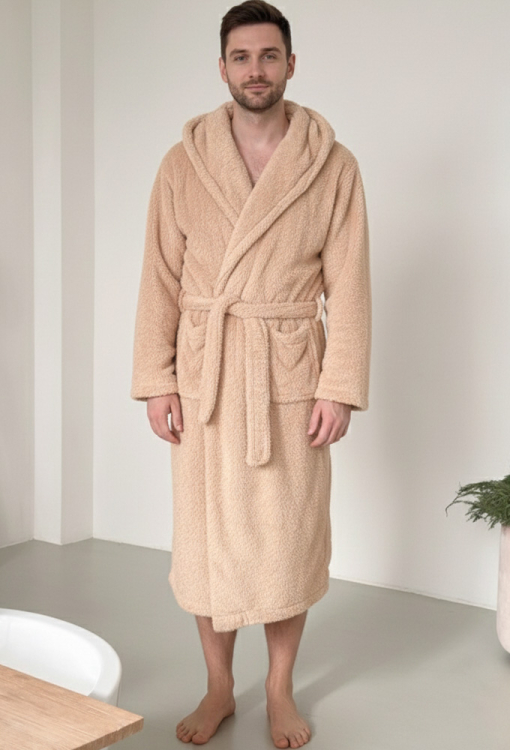 Теплый мужской халат Cuddle от украинского бренда Cosy. Халат выполнен из качественного и мягкого велсофта бежевого цвета, свободного силуэта и длиной ниже колен. Модель с длинными рукавами, капюшоном и удобными боковыми карманами, завязывается на запах с помощью пояса. Рукава изделия обработаны свободными манжетами, за счет которых регулируется длина. Халат красивый и очень комфортный, идеален для холодных зимних вечеров дома, а также подойдет в качестве подарка любимому или близкому человеку.