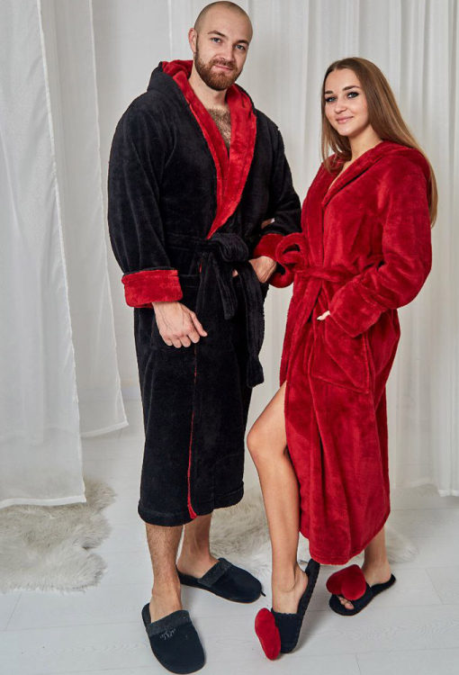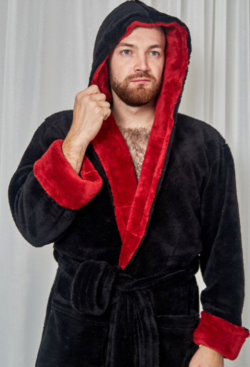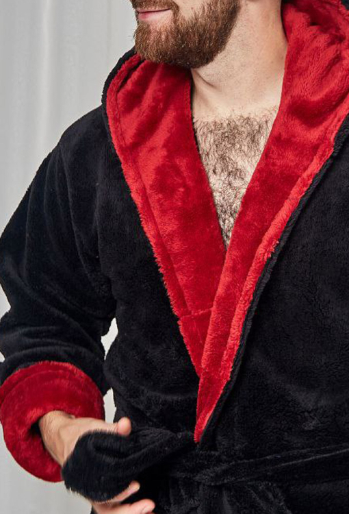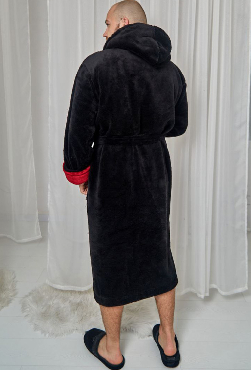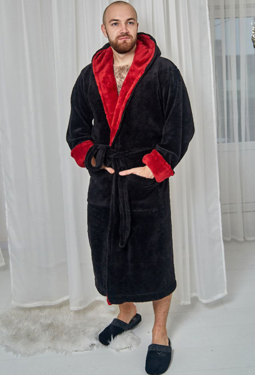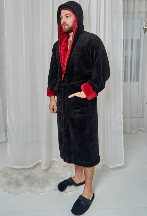 Теплый и приятный к телу мужской халат от украинского бренда Tomiko. Халат выполнен из мягкого и качественного велсофта черного цвета, с длинными рукавами и капюшоном. Модель длиной ниже колен и с удобными накладными карманами, завязывается на запах с помощью пояса. Капюшон внутри и отложные манжеты изделия выполнены из велсофта бордового цвета. Халат очень красивый и комфортный, идеален после ванной, бассейна и для домашнего уюта, а также может быть отличным подарком любимому или близкому человеку.