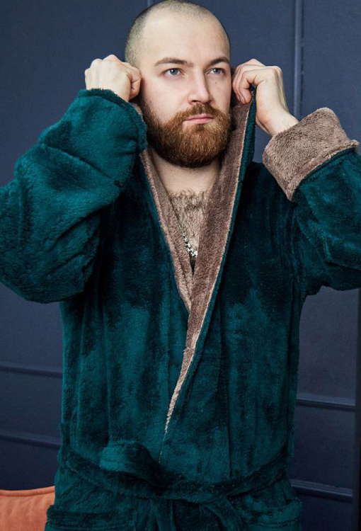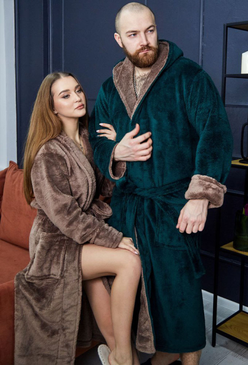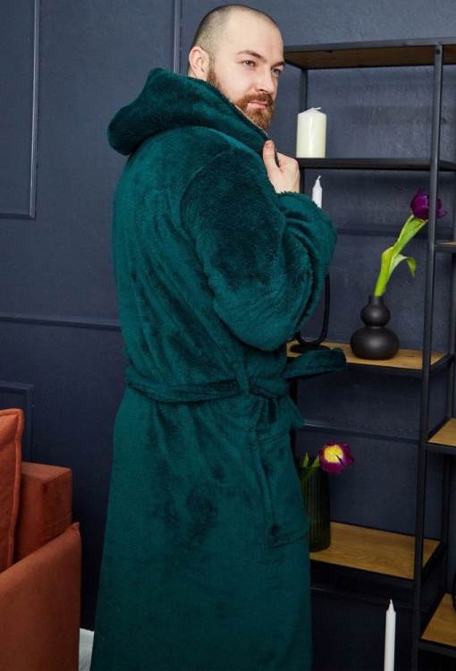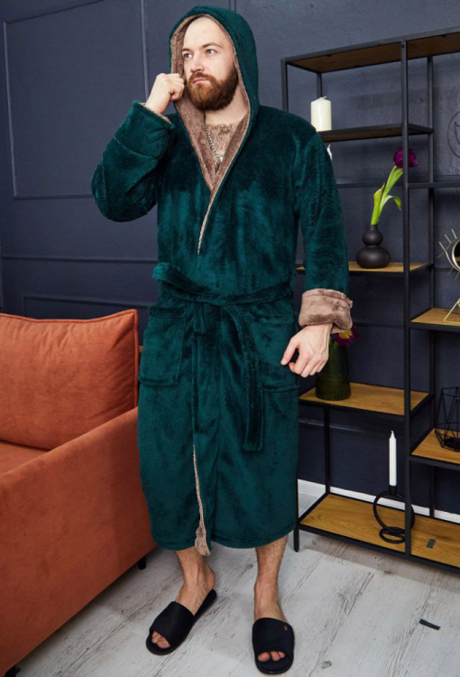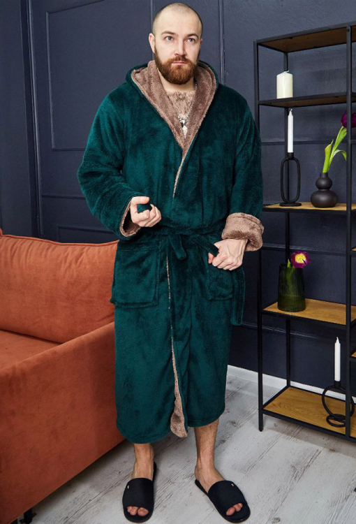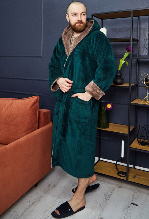 Теплый и приятный к телу мужской халат от украинского бренда Tomiko. Халат выполнен из мягкого и качественного велсофта изумрудного цвета, с длинными рукавами и капюшоном. Модель длиной ниже колен и с удобными накладными карманами, завязывается на запах с помощью пояса. Капюшон внутри и отложные манжеты изделия выполнены из велсофта шоколадного цвета. Халат очень красивый и комфортный, идеален после ванной, бассейна и для домашнего уюта, а также может быть отличным подарком любимому или близкому человеку.