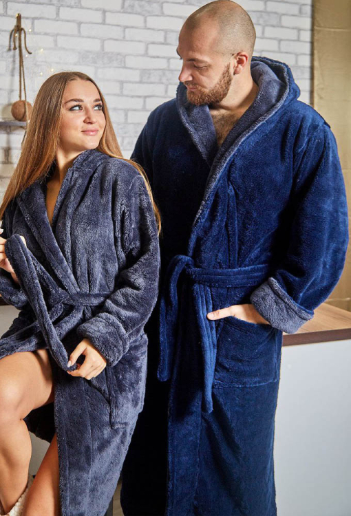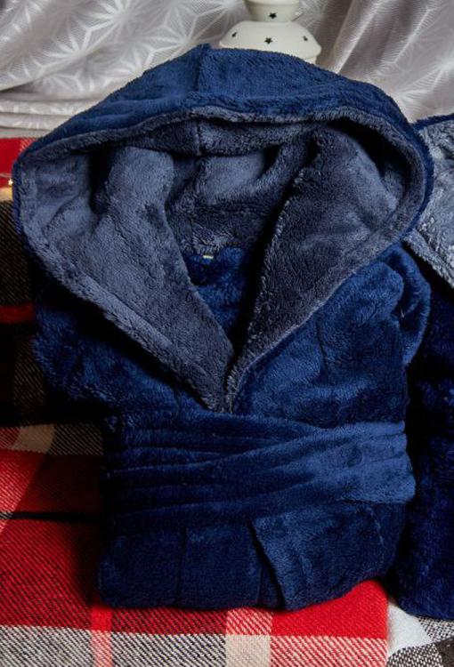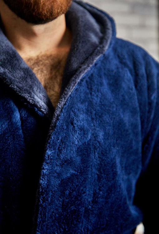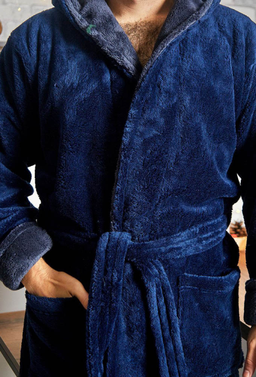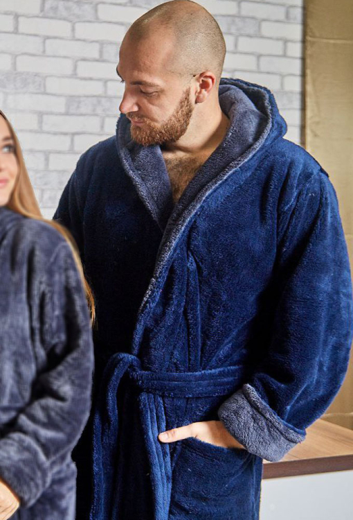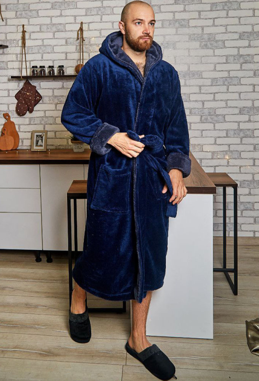 Теплый и приятный к телу мужской халат от украинского бренда Tomiko. Халат выполнен из мягкого и качественного велсофта темно-синего цвета, с длинными рукавами и капюшоном. Модель длиной ниже колен и с удобными накладными карманами, завязывается на запах с помощью пояса. Капюшон внутри и отложные манжеты изделия выполнены из велсофта графитового цвета. Халат очень красивый и комфортный, идеален после ванной, бассейна и для домашнего уюта, а также может быть отличным подарком любимому или близкому человеку.