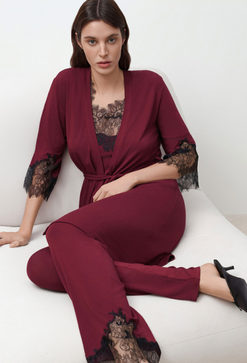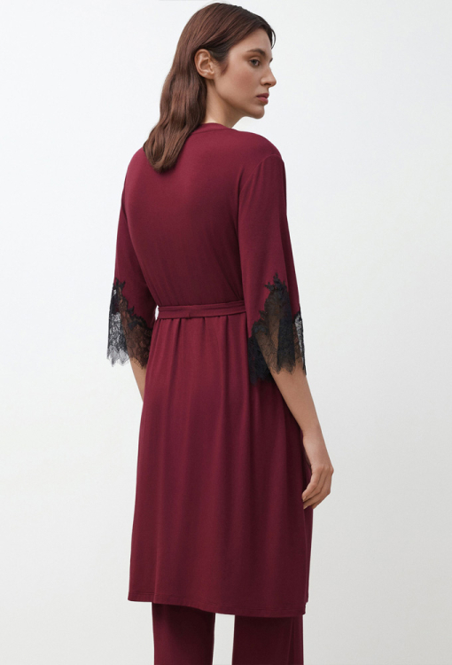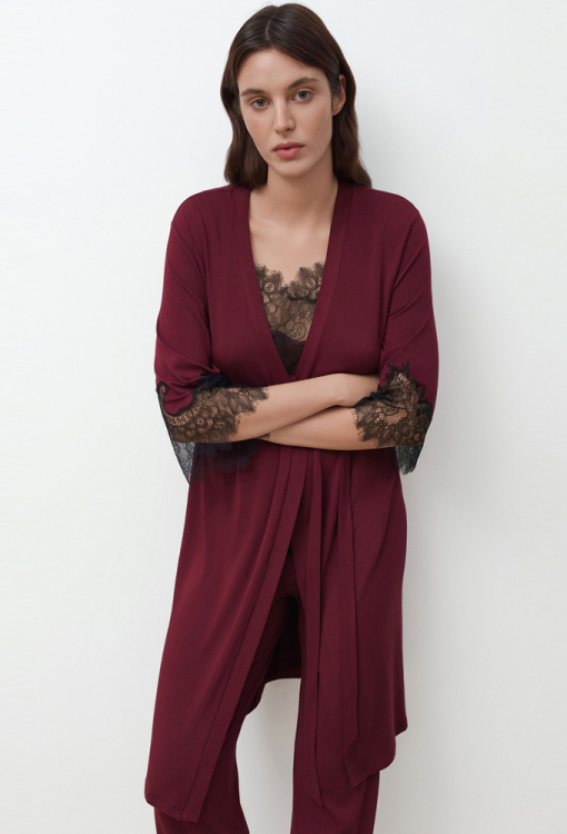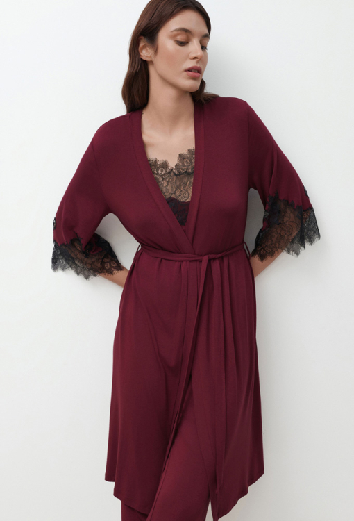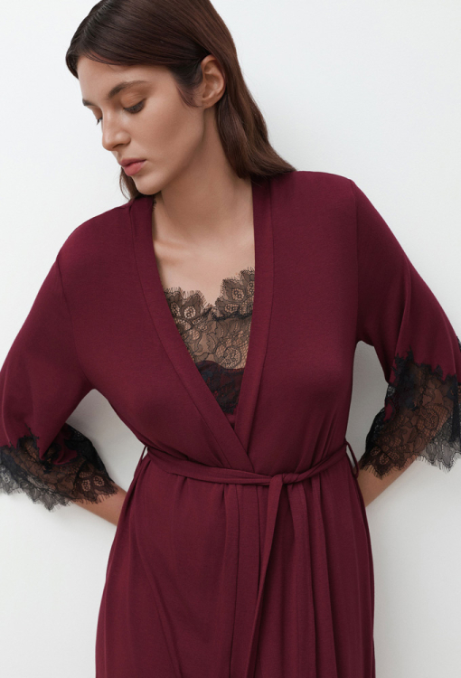 Классический женский халат из коллекции Angel’s Touch от итальянского бренда Effetto. Халат выполнен из мягкого и качественного бамбука бордового цвета, свободного силуэта и длиной выше колен. Модель с рукавами 3/4, завязывается на запах с помощью пояса, рукава изделия украшены широкими вставками из фигурно вырезанного кружева черного цвета. Халат очень красивый и комфортный, позволит создать стильный образ для домашнего отдыха, а также может быть замечательным подарком любимому и близкому человеку.