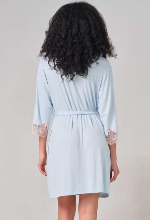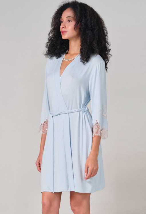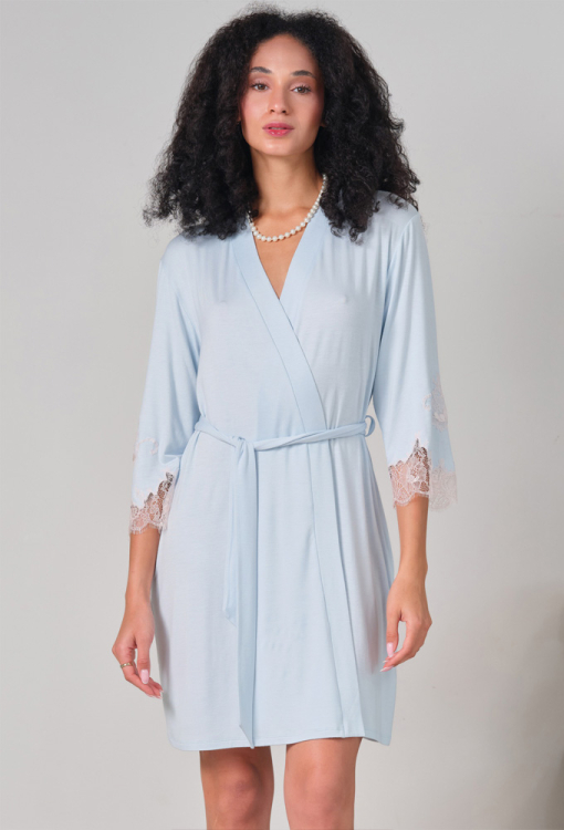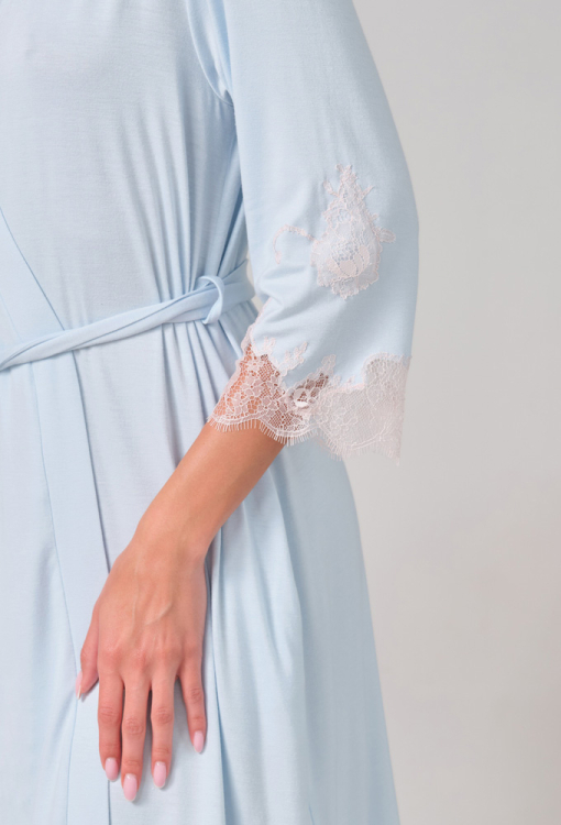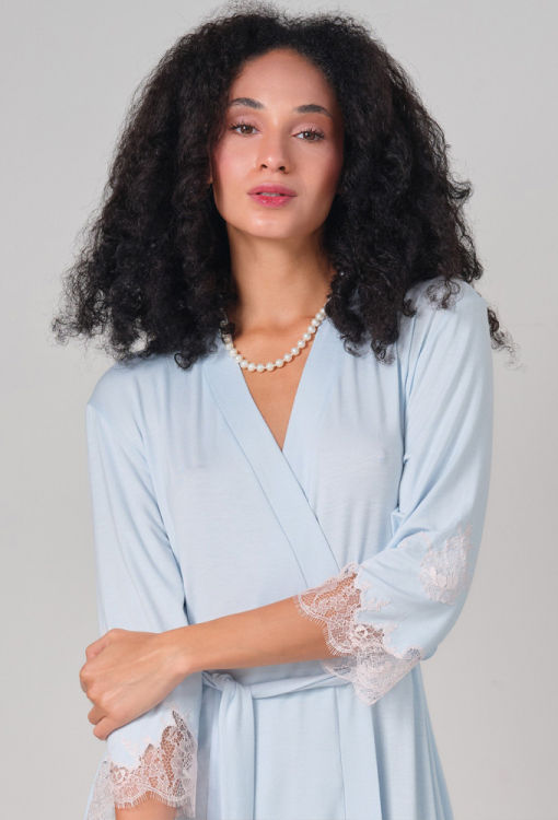 Нежный женский халат из коллекции Core от итальянского бренда Effetto. Халат выполнен из мягкого и качественного бамбука голубого цвета, свободного силуэта и длиной выше колен. Модель с рукавами 7/8 завязывается на запах с помощью пояса, рукава изделия украшены вставками и аппликациями из изысканного итальянского кружева кремового цвета. Халат очень красивый и комфортный, позволит создать стильный образ для домашнего отдыха, а также может быть замечательным подарком любимому и близкому человеку.