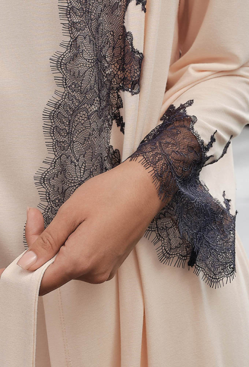 Роскошный женский халат из коллекции Core от итальянского бренда Effetto. Халат выполнен из мягкого и качественного бамбука бежевого цвета, свободного силуэта и длиной выше колен. Модель с длинными рукавами завязывается на запах с помощью пояса, линия выреза и рукава изделия украшены вставками из итальянского кружева темно-синего цвета с ресничками и вырезным краем. Халат очень красивый и комфортный, позволит создать стильный образ для домашнего отдыха, а также может быть замечательным подарком любимому и близкому человеку.