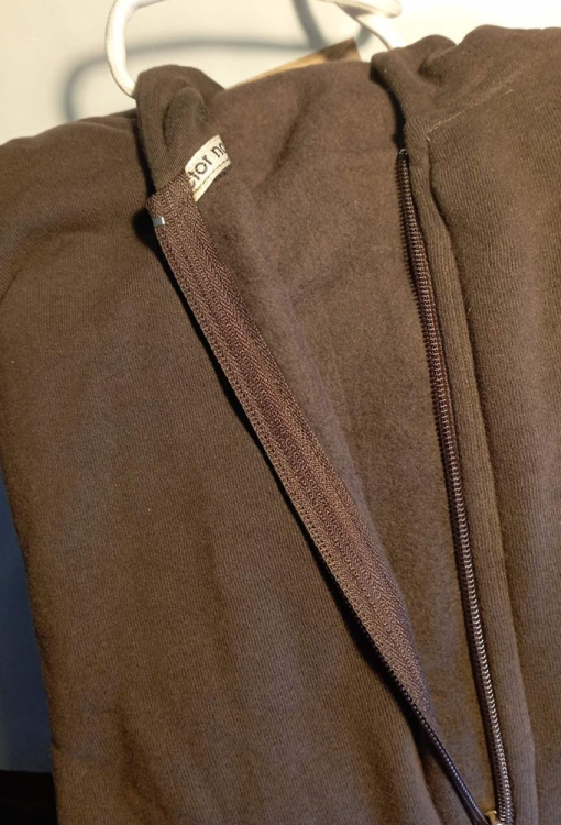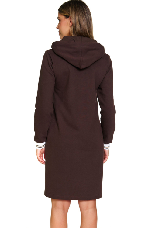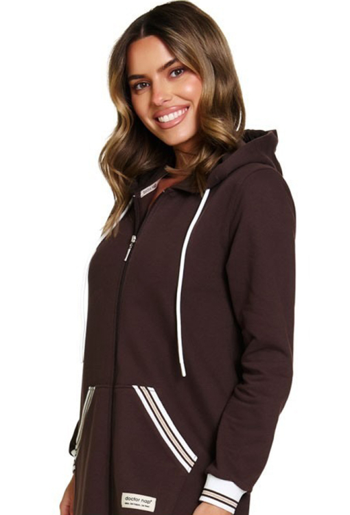 Теплый и комфортный женский халат от польского бренда Doctor Nap. Халат выполнен из качественного и мягкого хлопка с начесом по внутренней стороне, коричневого цвета, с длинными рукавами и капюшоном. Модель прямого силуэта, длиной выше колен и с карманами кенгуру, застегивается на молнию, ширина капюшона регулируется с помощью внутреннего шнурка белого цвета. Рукава изделия обработаны трикотажными манжетами белого цвета в полоску, карманы украшены в тон манжет. Халат очень красивый и удобный, идеальный вариант одежды для уютных домашних вечеров, также может быть хорошим подарком любимому и близкому человеку.