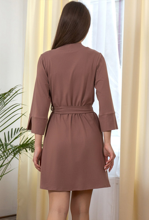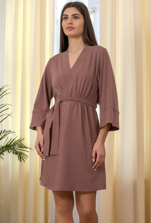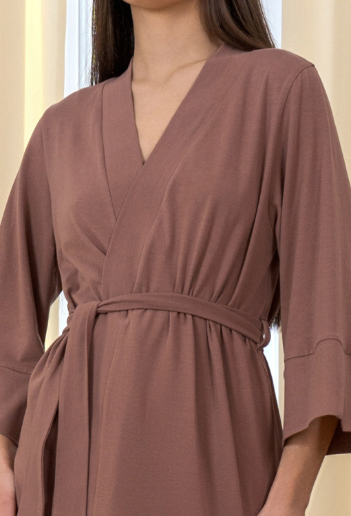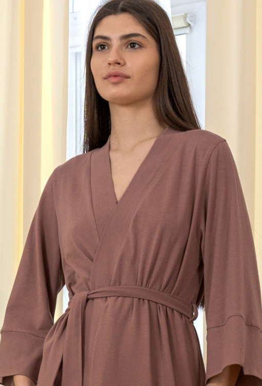 Элегантный женский халат из коллекции Donna от украинского бренда Roksana. Халат выполнен из мягкого и качественного хлопка коричневого цвета, с рукавами 3/4 и длиной выше колен. Модель свободного силуэта и завязывается на запах с помощью пояса, рукава обработаны свободными манжетами с разрезами. Изделие идеально подойдет для утренних ритуалов, спокойных вечеров и домашних выходных. Халат очень красивый и комфортный, также может быть отличным подарком любимому и близкому человеку.
