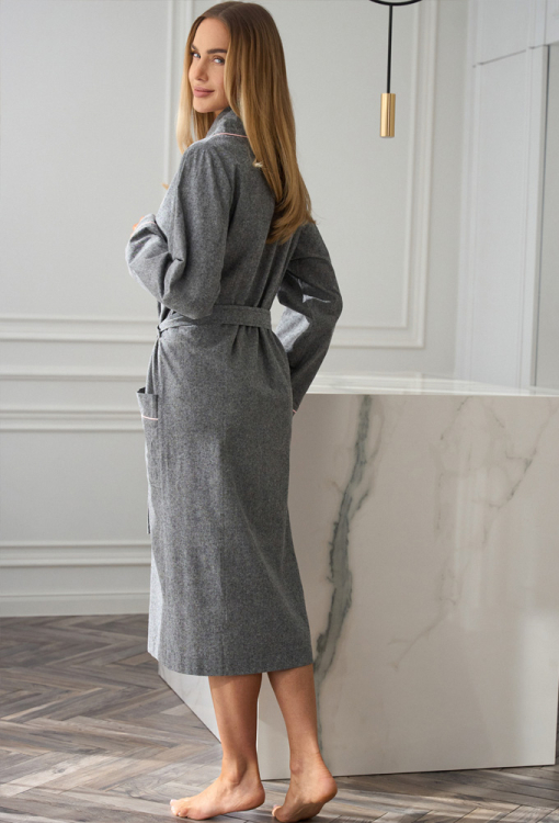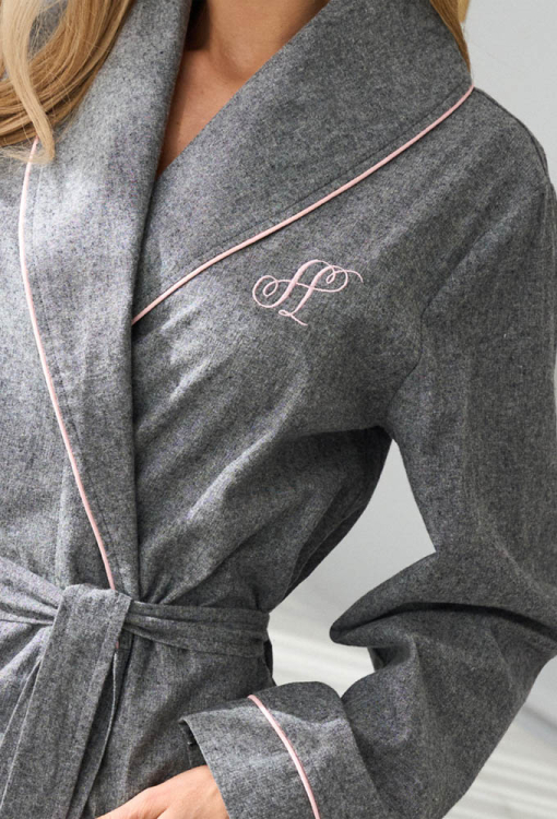 Элегантный женский халат от польского бренда L&L. Халат выполнен из качественного и мягкого хлопка серого цвета, с длинными рукавами и воротником шаль. Модель свободного силуэта, длиной выше колен и с удобными накладными карманами, завязывается на запах с помощью пояса. Воротник, борта, рукава и карманы изделия украшены тонким кантом розового цвета, на груди слева изящная вышивка в виде лого бренда. Халат очень красивый и комфортный, идеально подойдет для прохладного утра или вечера, а также может быть полезным подарком любимому и близкому человеку.