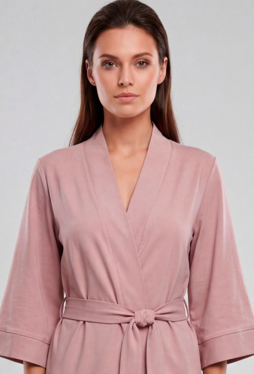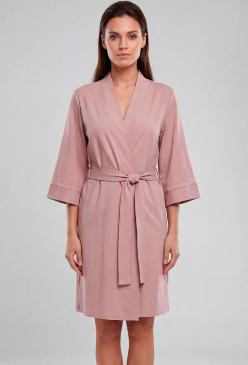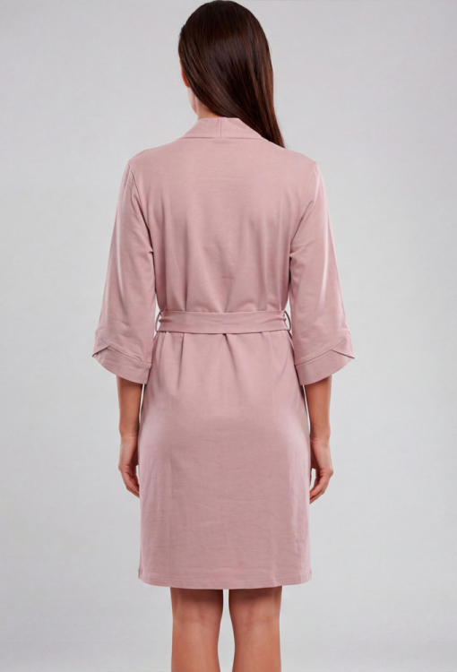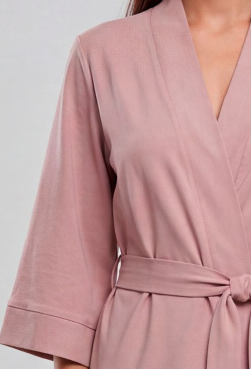 Элегантный женский халат из коллекции Marilin от украинского бренда Roksana. Халат выполнен из мягкого и качественного хлопка кофейного цвета, с рукавами 3/4 и длиной выше колен. Модель свободного силуэта и завязывается на запах с помощью пояса, рукава обработаны свободными манжетами. Изделие идеально подойдет как для утреннего, так и для вечернего домашнего образа. Халат очень красивый и комфортный, также может быть отличным подарком любимому и близкому человеку.