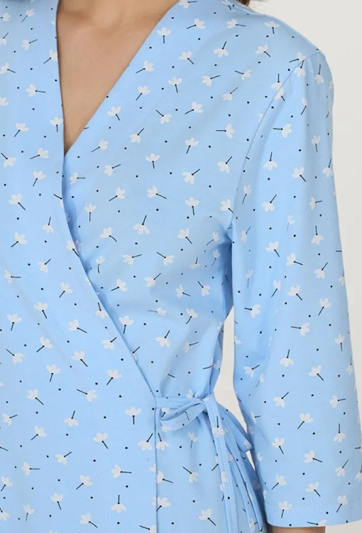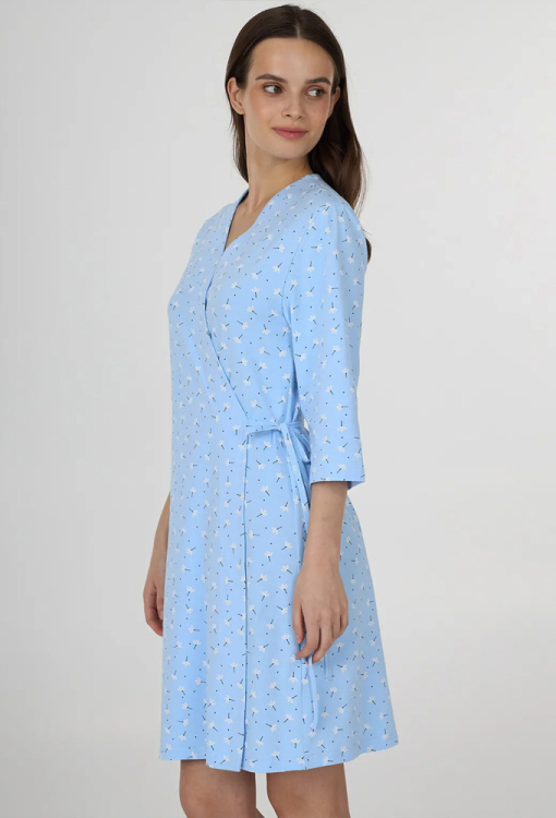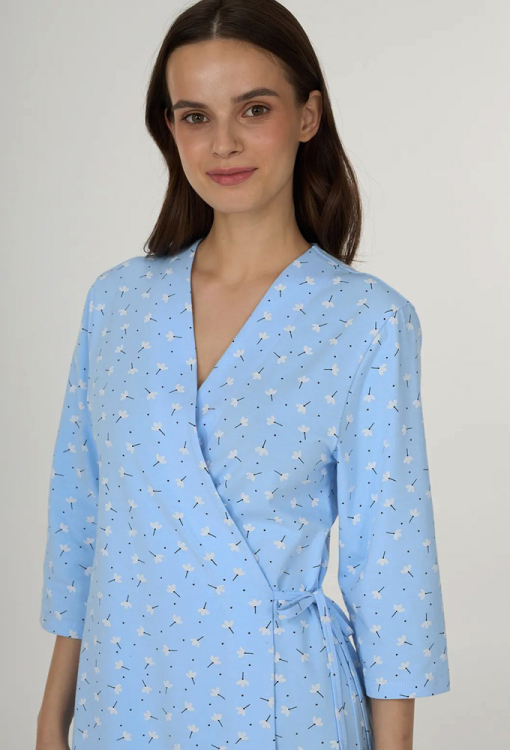 Летний женский халат из коллекции Summer Song от украинского бренда Ellen. Халат выполнен из качественного и мягкого хлопка, голубого цвета в принт из мелких белых цветочков, с рукавами 3/4 и длиной выше колен. Модель свободного силуэта завязывается на запах с помощью тонких завязок. Халат очень красивый и комфортный, обладает превосходной воздухопроницаемостью, не сковывает движений, идеален для дома или подарка любимому и близкому человеку.
