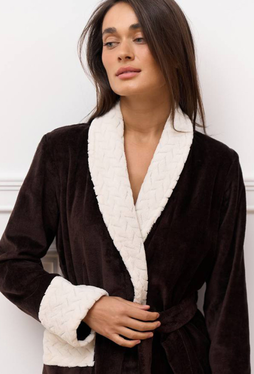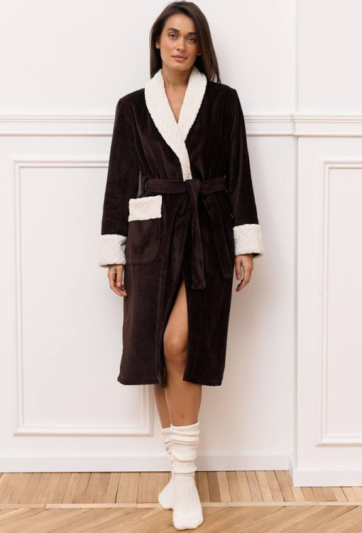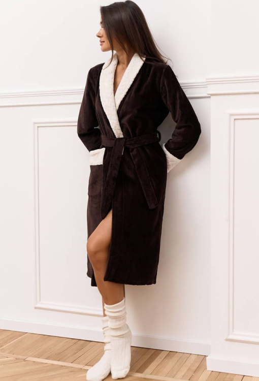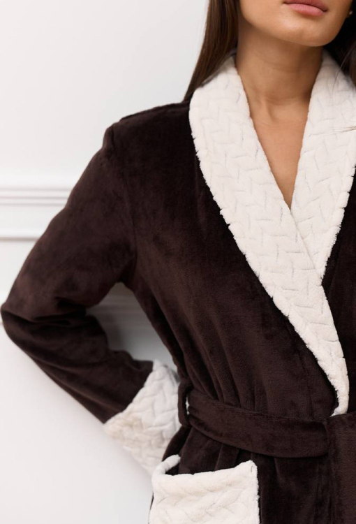 Длинный женский халат от украинского бренда DaLi. Халат выполнен из качественной и мягкой велюровой махры шоколадного цвета, свободного кроя и с воротником шаль. Модель с длинными рукавами и двумя накладными карманами, завязывается на запах с помощью пояса. Воротник, манжеты на рукавах и карманы украшены тканью белого цвета с рельефным узором. Внутрення сторона изделия - классическая махра, наружная - гладкая с небольшим блеском. Халат теплый, приятный к телу и отлично впитывает влагу, идеален после принятия водных процедур, а также может быть замечательным подарком любимому и близкому человеку.