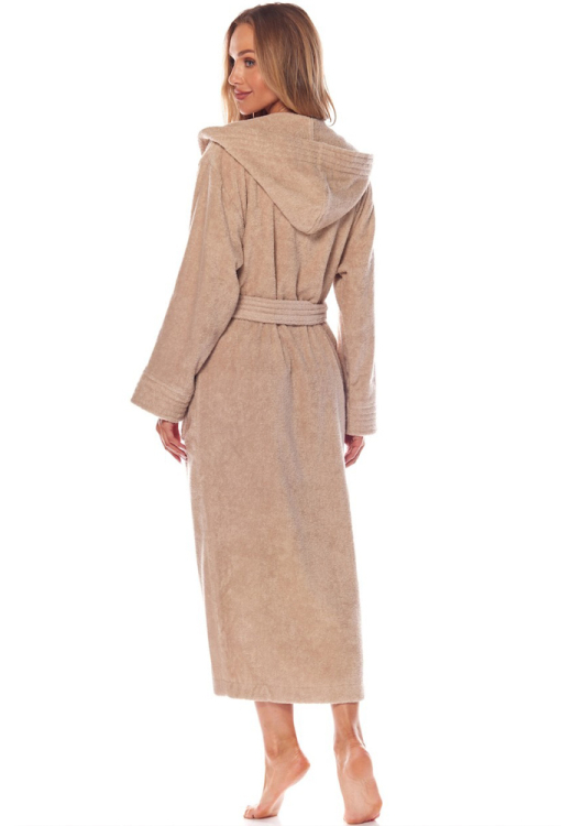 Комфортный женский халат от польского бренда L&L. Халат выполнен из качественной, мягкой и натуральной махры бежевого цвета, свободного силуэта и длиной ниже колен. Модель с длинными рукавами и капюшоном, завязывается на запах с помощью пояса. Изделие обработано двумя накладными карманами, капюшон, рукава, карманы и пояс украшены декоративной строчкой. Халат очень красивый и удобный, отлично впитывает влагу, идеален для душа, сауны, бассейна, а также может быть полезным подарком для любимому и близкому человеку.