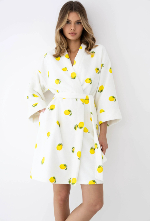 Приятный к телу женский халат Lemons от польского бренда Sensis. Халат выполнен из качественной и мягкой махры, белого цвета с принтом в виде желтых лимонов, с рукавами 7/8 и заниженной линией плеча. Модель свободного силуэта и длиной выше колен, завязывается на запах с помощью пояса, по бокам расположены удобные карманы. Халат очень красивый и комфортный, отлично впитывает влагу, можно использовать сразу после купания, а также подойдет в качестве подарка любимому или близкому человеку.