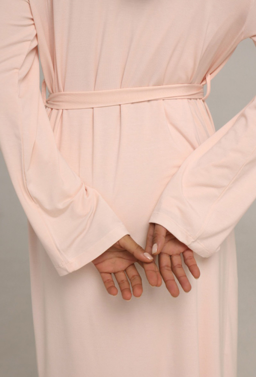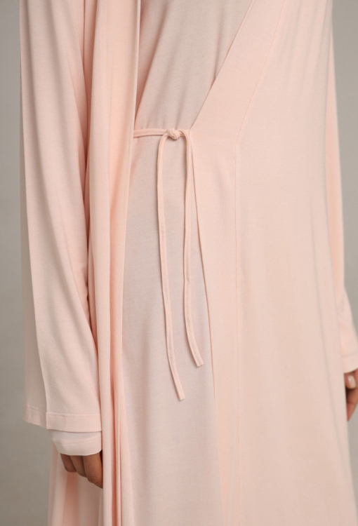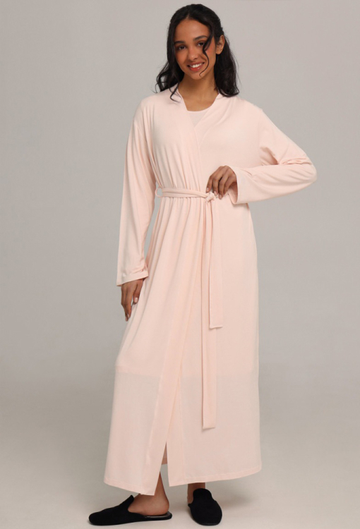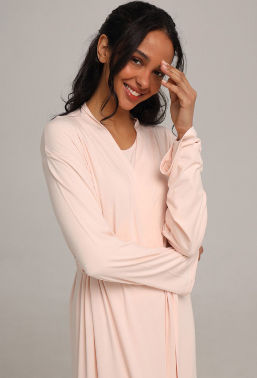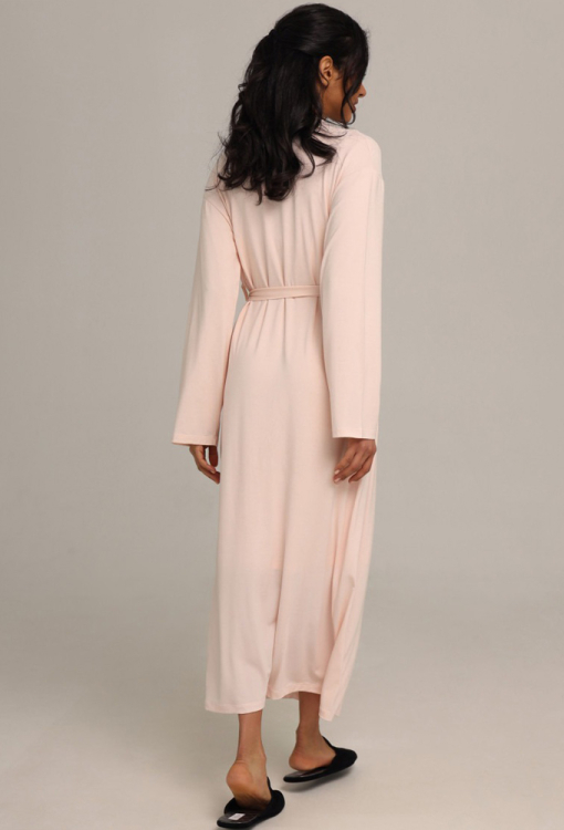 Домашний женский халат от украинского бренда German Volf. Халат выполнен из качественного и мягкого модала кремового цвета, свободного силуэта и длиной ниже колен. Модель с длинными рукавами, завязывается на запах с помощью пояса и завязок внутри. Халат очень красивый и комфортный, идеальный выбор для домашнего уюта, отдыха и приятных моментов заботы о себе, также может быть замечательным подарком близким людям.