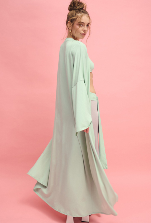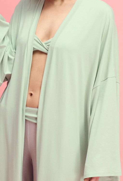 Шикарный женский халат из коллекции Nua от украинского бренда Leinle. Халат выполнен из мягкого и качественного модала с хлопком и эластаном светло-зеленого цвета, свободного силуэта и длиной в пол. Модель с широкими длинными рукавами и заниженным плечевым швом, завязывается на запах с помощью пояса. Изделие задумано как ритуал покоя: для дома, спа, массажа, медленных утренних сборов и тихих вечеров, когда тело имеет право на отдых. Халат очень красивый и комфортный, также может быть полезным подарком любимому и близкому человеку.