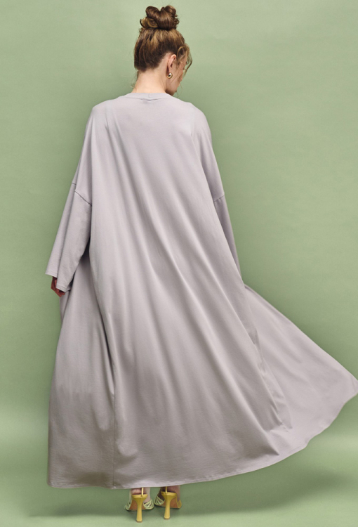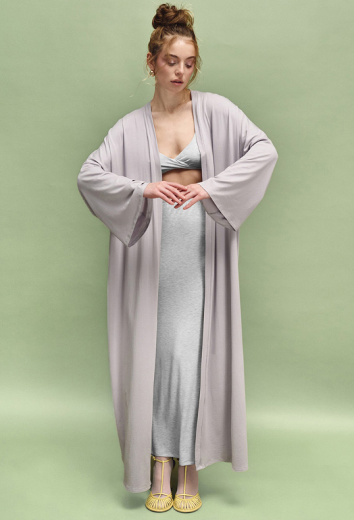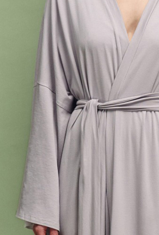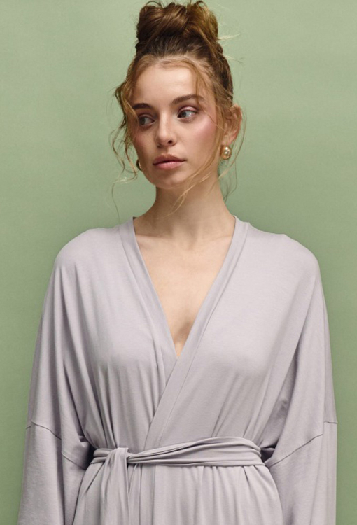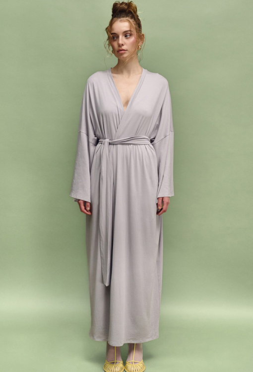Шикарный женский халат из коллекции Nua от украинского бренда Leinle. Халат выполнен из мягкого и качественного модала с хлопком и эластаном серого цвета, свободного силуэта и длиной в пол. Модель с широкими длинными рукавами и заниженным плечевым швом, завязывается на запах с помощью пояса. Изделие задумано как ритуал покоя: для дома, спа, массажа, медленных утренних сборов и тихих вечеров, когда тело имеет право на отдых. Халат очень красивый и комфортный, также может быть полезным подарком любимому и близкому человеку.
