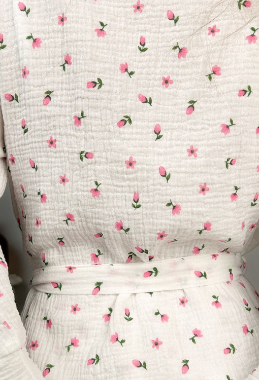 Нежный женский халат от украинского бренда LoomLine. Халат выполнен из качественного и мягкого двухслойного муслина белого цвета, с принтом в виде мелких тюльпанов розового цвета с зелеными листьями, свободного кроя и с рукавами 3/4. Модель длиной выше колен со свободными манжетами на рукавах, завязывается на запах с помощью пояса и завязок внутри. Халат очень красивый и комфортный, идеален для домашнего пользования, а также может быть замечательным подарком любимому и близкому человеку.