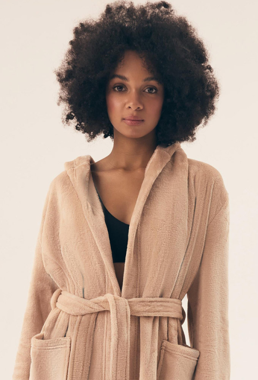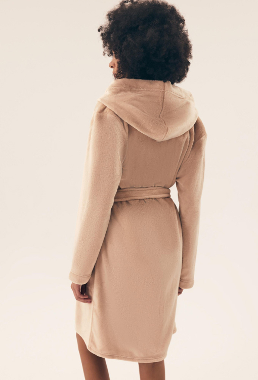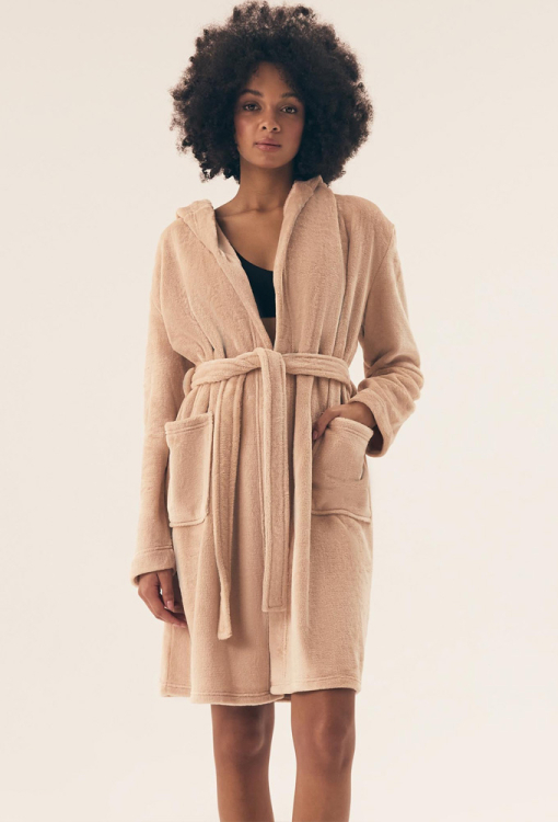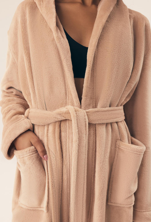 Теплый женский халат Bird от польского бренда Henderson Ladies. Халат выполнен из качественного и мягкого плюша бежевого цвета, свободного силуэта и длиной выше колен. Модель с длинными рукавами, капюшоном и двумя накладными карманами, завязывается на запах с помощью пояса. Халат очень красивый и комфортный, согреет утром или прохладными вечерами, а также может быть прекрасным подарком для любимого или близкого человека.