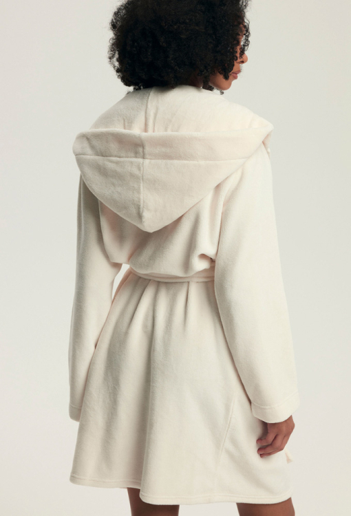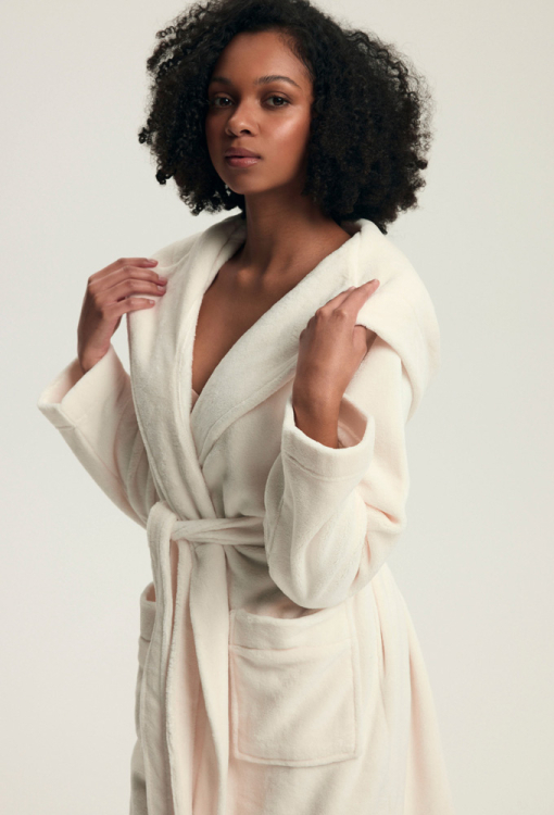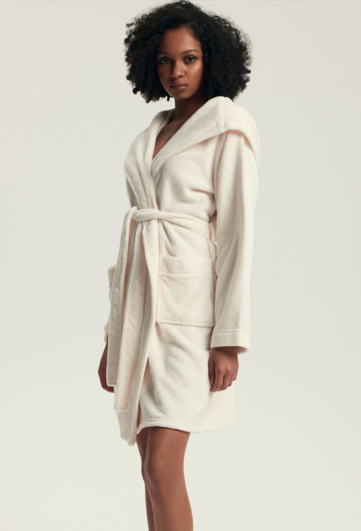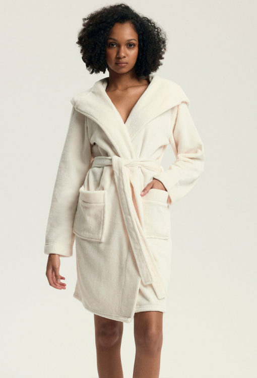 Теплый и уютный женский халат Darlan от польского бренда Henderson Ladies. Халат выполнен из качественного и мягкого плюша кремового цвета, свободного силуэта и длиной выше колен. Модель с длинными рукавами, капюшоном и двумя накладными карманами, завязывается на запах с помощью пояса. Халат очень красивый и комфортный, согреет утром или прохладными вечерами, а также может быть прекрасным подарком для любимого или близкого человека.