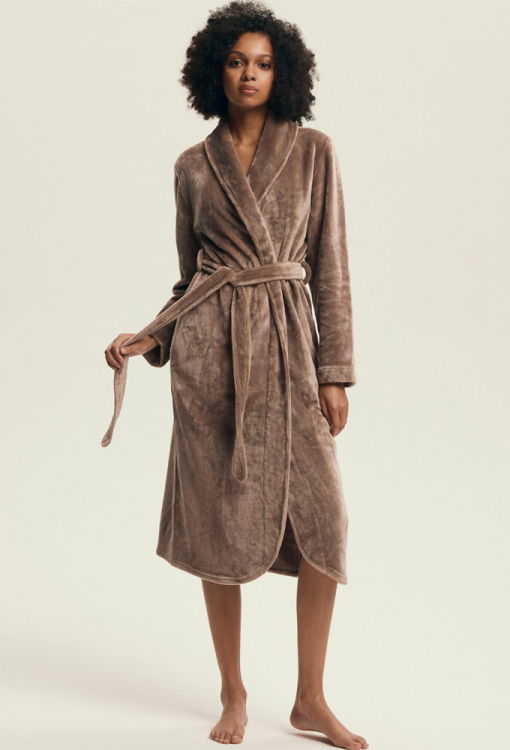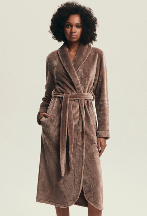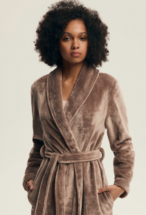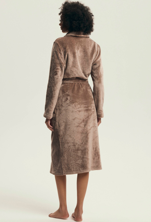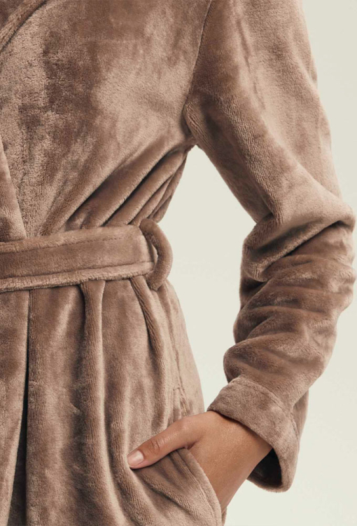 Элегантный и невероятно теплый женский халат Dextra от польского бренда Henderson Ladies. Халат выполнен из качественного и мягкого плюша коричневого цвета, свободного силуэта, длиной чуть ниже колен и с закругленными полками. Модель с длинными рукавами, шалевым воротником и удобными боковыми карманами, завязывается на запах с помощью пояса. Халат очень красивый и комфортный, согреет утром или прохладными вечерами, а также может быть прекрасным подарком для любимого или близкого человека.