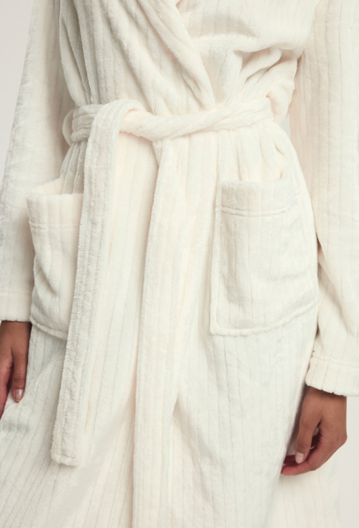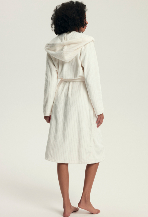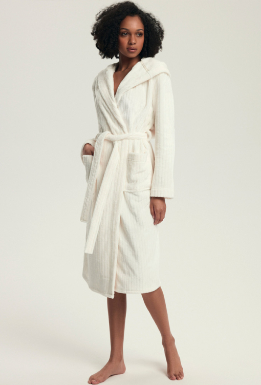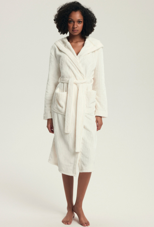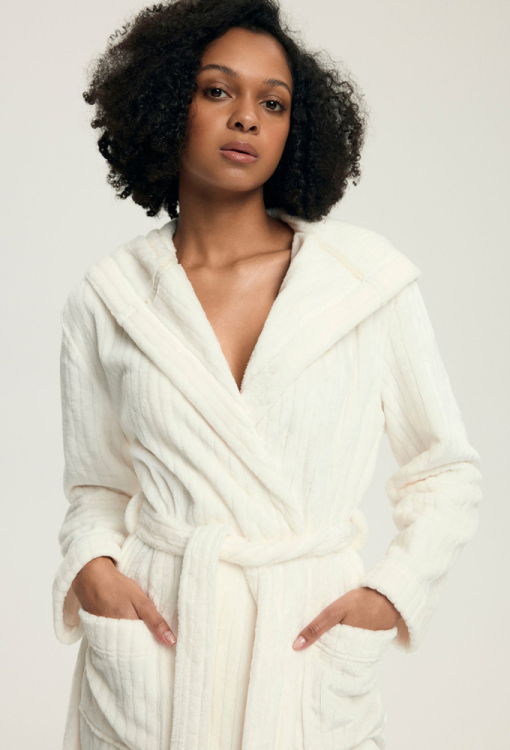 Теплый и стильный женский халат Dionne от польского бренда Henderson Ladies. Халат выполнен из качественного и мягкого плюша с полосатой фактурой кремового цвета, свободного силуэта и длиной чуть ниже колен. Модель с длинными рукавами, удобным капюшоном и двумя накладными карманами, завязывается на запах с помощью пояса. Халат очень красивый и комфортный, согреет утром или прохладными вечерами, а также может быть прекрасным подарком для любимого или близкого человека.