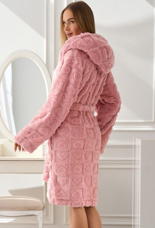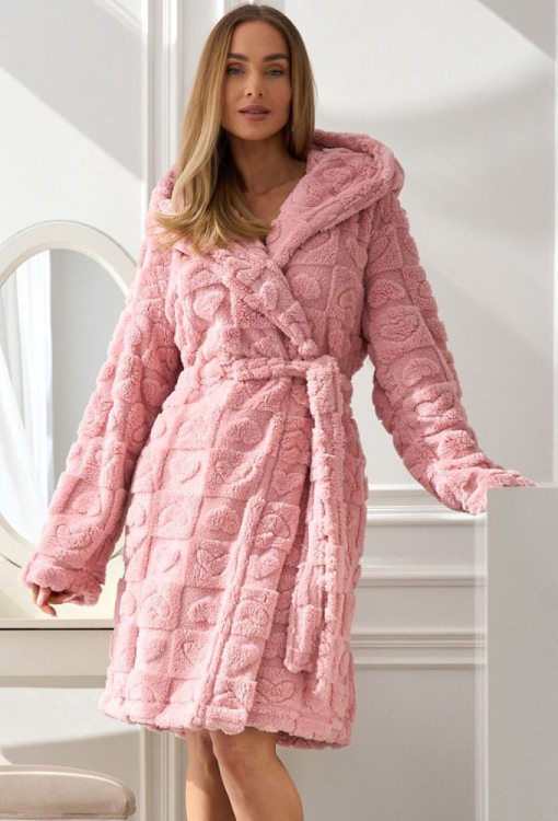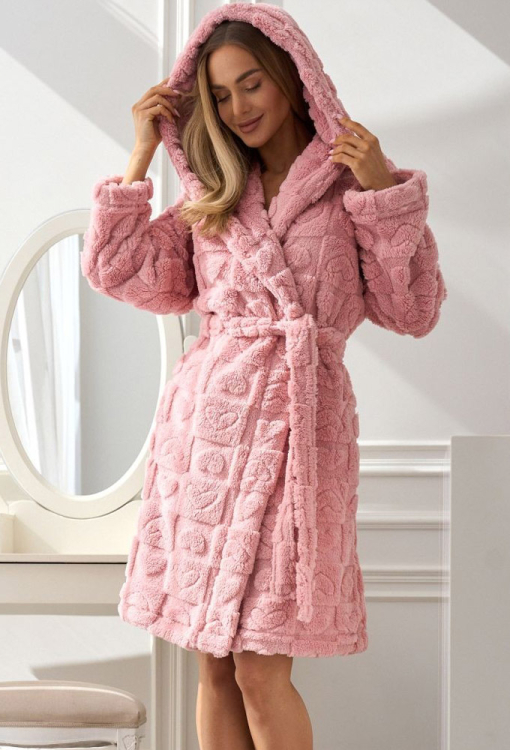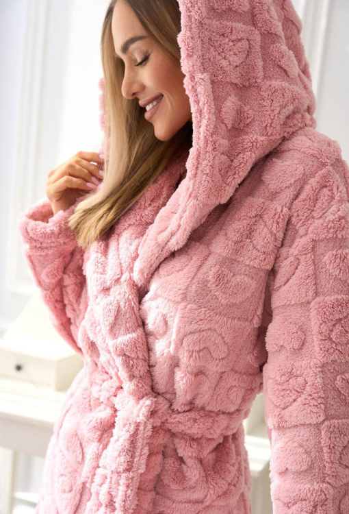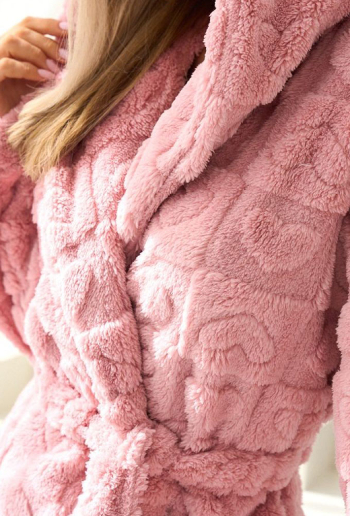 Легкий теплый женский халат от польского бренда L&L. Халат выполнен из качественного и мягкого плюша, цвета пудры с рельефным рисунком в виде сердец, свободного силуэта и длиной немного выше колен. Модель с длинными рукавами, капюшоном и удобными боковыми карманами, завязывается на запах с помощью пояса. Халат очень красивый и комфортный, идеально подходит для ношения утром, вечером или после ванны, а также может быть замечательным подарком любимому и близкому человеку.