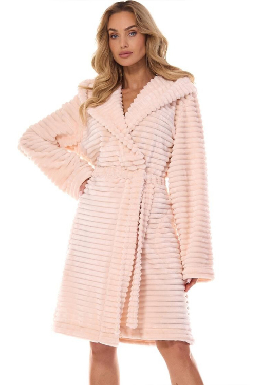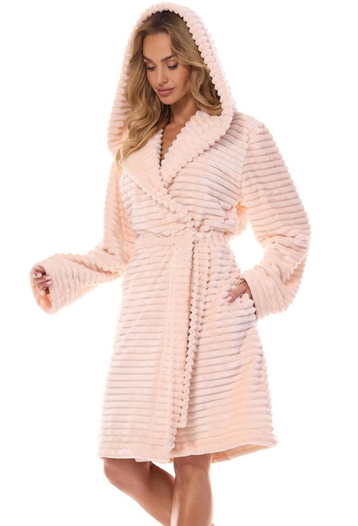 Красивый женский халат Robin от польского бренда L&L. Халат выполнен из качественного и мягкого плюша с рельефным узором, абрикосового цвета, с длинными рукавами и капюшоном. Модель свободного силуэта и с удобными боковыми карманами, завязывается на запах с помощью пояса. Халат стильный и очень комфортный, идеален для домашнего пользования, а также может быть полезным подарком любимому и близкому человеку.