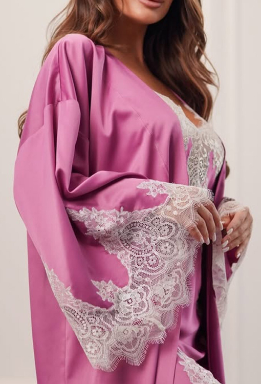 Шикарный женский халат из коллекции Azalea от украинского бренда Komilfo. Халат выполнен из мягкого и качественного шелк-сатина цвета фуксия, свободного кроя и длиной выше колен. Модель с широкими длинными рукавами и заниженніым плечевым швом, завязывается на запах с помощью пояса, рукава украшены широкими вставками из ажурного кружева белого цвета с вырезным краем. Халат очень красивый и комфортный, упакованный в фирменную коробку, может быть прекрасным подарком близким людям!