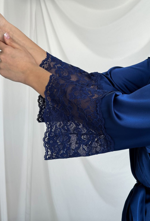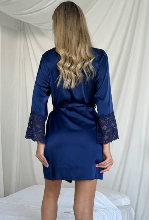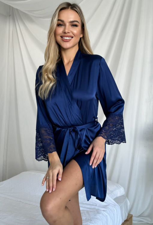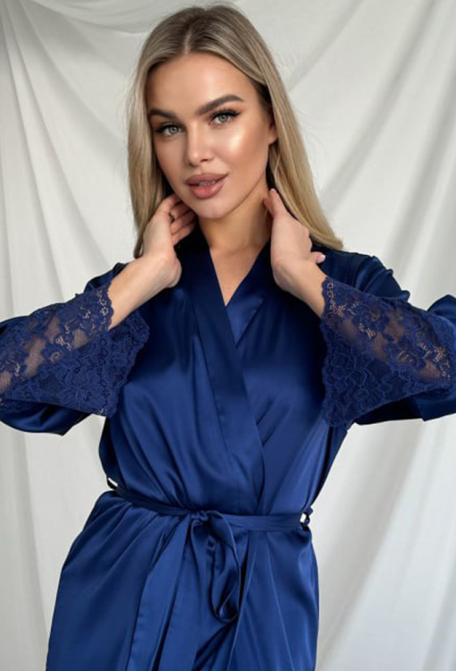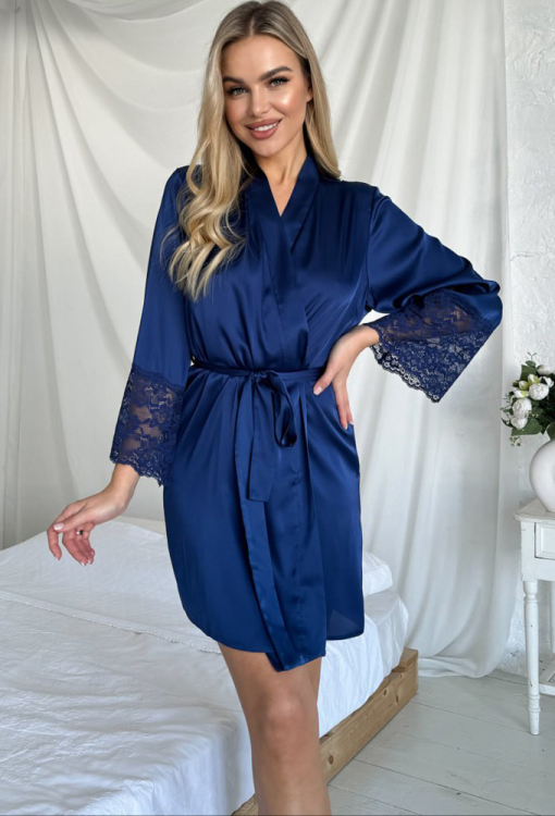 Изысканный женский халат от украинского бренда Julia Ulich. Халат выполнен из мягкого и качественного шелк-сатина синего цвета, свободного кроя и с рукавами 7/8. Модель длиной выше колен завязывается на запах с помощью пояса, рукава внизу украшены широкими вставками из ажурного кружева. Халат очень красивый и комфортный, создан, чтобы чувствовать себя особенно даже в самые обычные дни, также может быть прекрасным подарком близким людям!