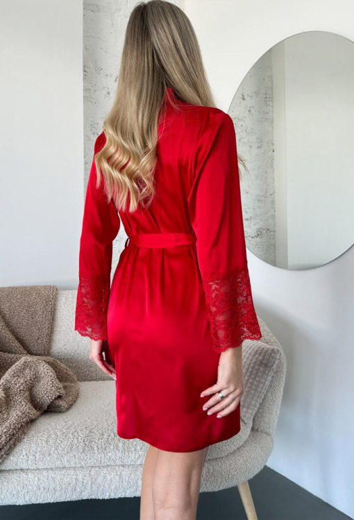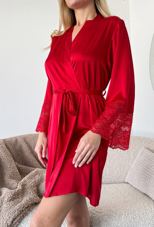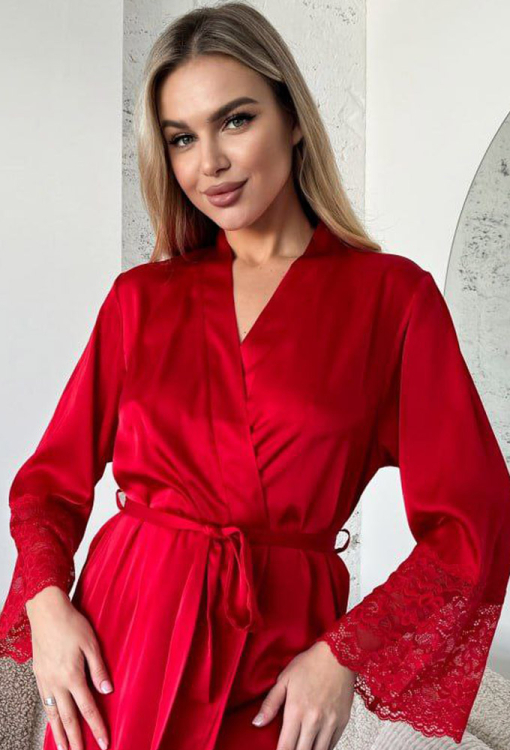 Изысканный женский халат от украинского бренда Julia Ulich. Халат выполнен из мягкого и качественного шелк-сатина красного цвета, свободного кроя и с рукавами 7/8. Модель длиной выше колен завязывается на запах с помощью пояса, рукава внизу украшены широкими вставками из ажурного кружева. Халат очень красивый и комфортный, создан, чтобы чувствовать себя особенно даже в самые обычные дни, также может быть прекрасным подарком близким людям!