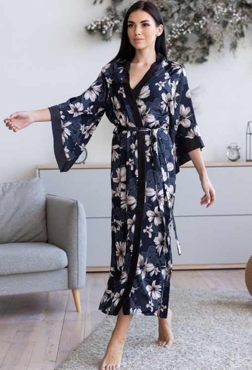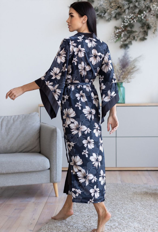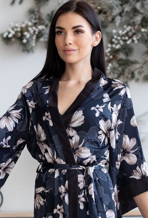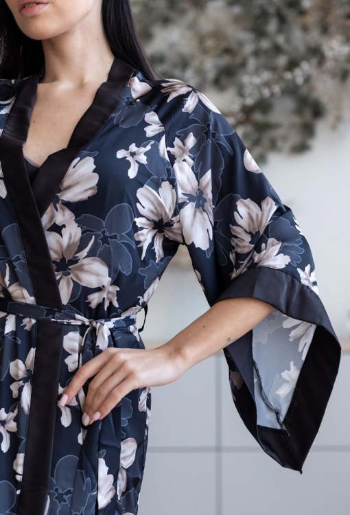 Красивый женский халат от украинского бренда MiaNaGreen. Халат выполнен из качественного и мягкого искусственного шелка, темно-синего цвета в принт из крупных цветов кремового цвета, с широкими рукавами 7/8 и длиной в пол. Модель свободного кроя, завязывается на запах с помощью пояса, линия выреза, борта и рукава украшены вставками из однотонного шелка графитового цвета. Внизу по бокам изделие обработано высокими разрезами. Халат шикарный и очень комфортный идеален для особенных домашних вечеров и утреннего кофе, а также может быть замечательным подарком любимому или близкому человеку.