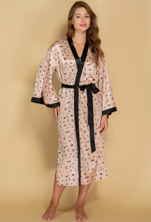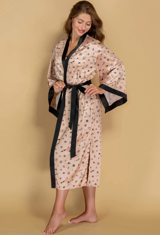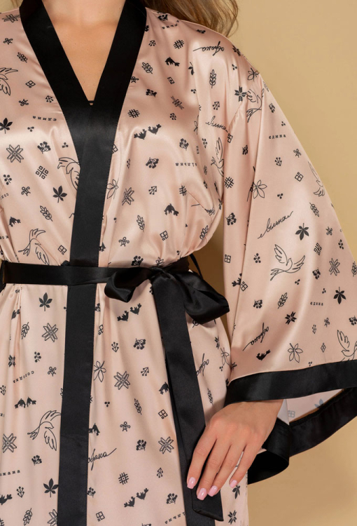 Красивый женский халат от украинского бренда Obrana. Халат выполнен из мягкого и качественного сатина, бежевого цвета с принтом из графических фигур, птиц и листья, свободного силуэта и длиной ниже колен. Модель с широкими длинными рукавами и заниженным плечевым швом завязывается на запах с помощью пояса, внизу по бокам разрезы. Вырез, рукава и борта изделия украшены вставками из однотонного шелка черного цвета, пояс выполнен в тон отделки. Халат стильный и очень комфортный, придаст королевского шарма домашнему образу, а также может быть прекрасным подарком любимому и близкому человеку!