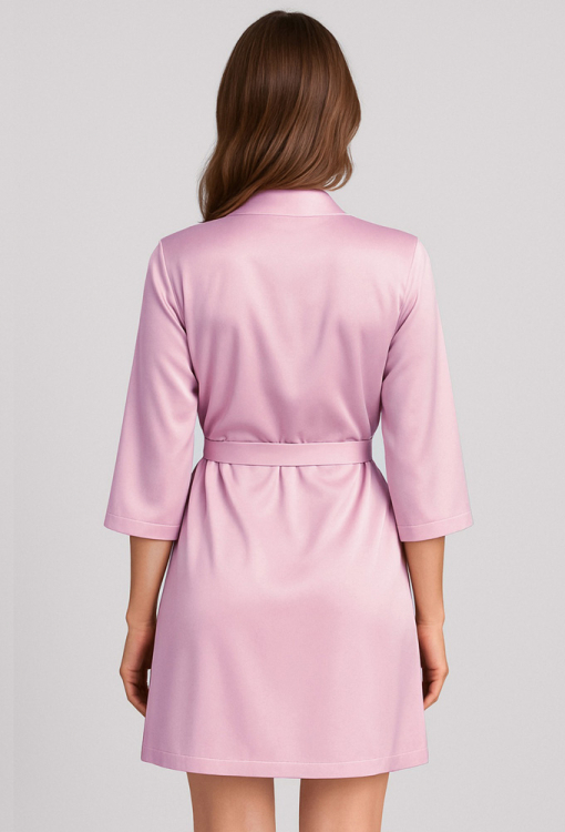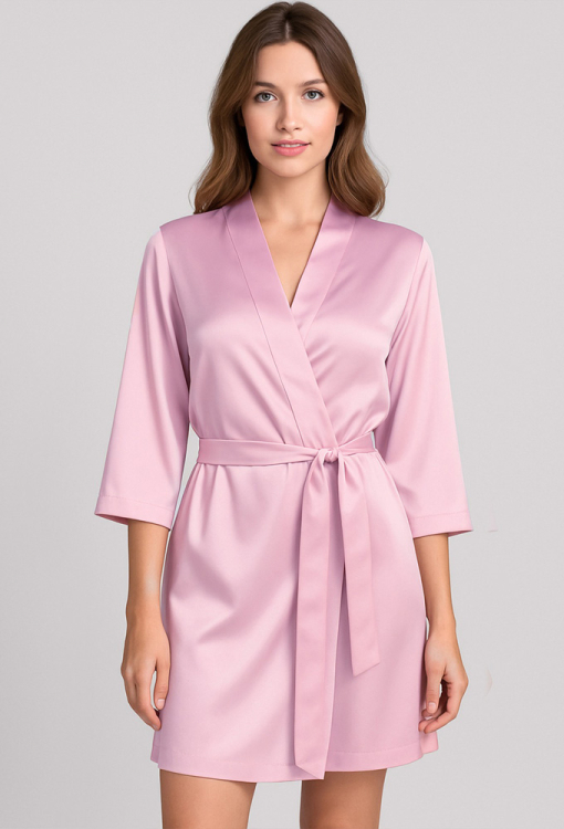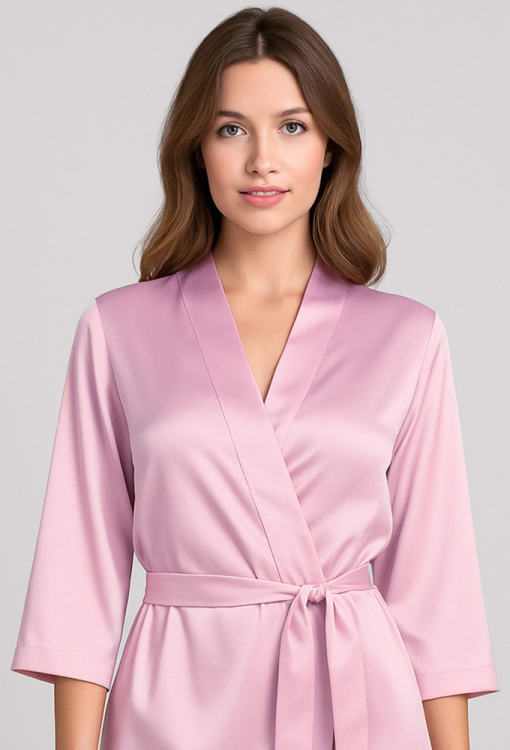 Классический женский халат из коллекции Ornelia от украинского бренда Leinle. Халат выполнен из мягкого и качественного искусственного шелка нежно-розового цвета, с рукавами 3/4 и длиной выше колен. Модель свободного силуэта завязывается на запах с помощью пояса. Халат очень красивый и комфортный, будет удобным в домашнем пользовании, а также может быть замечательным подарком для любимого и близкого человека.