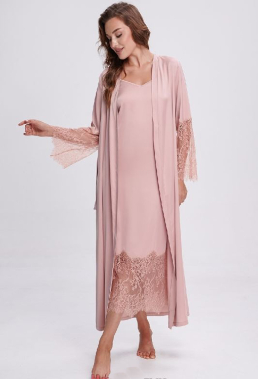 Элегантный женский халат от украинского бренда Shato. Халат выполнен из качественного и мягкого шелка Армани пудрового цвета, классического кроя и и длиной в пол. Модель с длинными рукавами, завязывается на запах с помощью пояса. Рукава украшены широкими вставками из ажурного кружева. Халат очень красивый и комфортный, идеальный для вечернего отдыха или утренних ритуалов, также может быть отличным подарком любимому или близкому человеку.