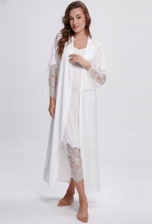Элегантный женский халат от украинского бренда Shato. Халат выполнен из качественного и мягкого шелка Армани кремового цвета, классического кроя и и длиной в пол. Модель с длинными рукавами, завязывается на запах с помощью пояса. Рукава украшены широкими вставками из ажурного кружева. Халат очень красивый и комфортный, идеальный для вечернего отдыха или утренних ритуалов, также может быть отличным подарком любимому или близкому человеку.