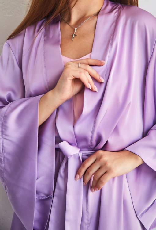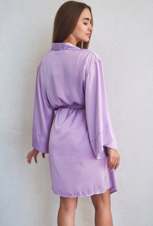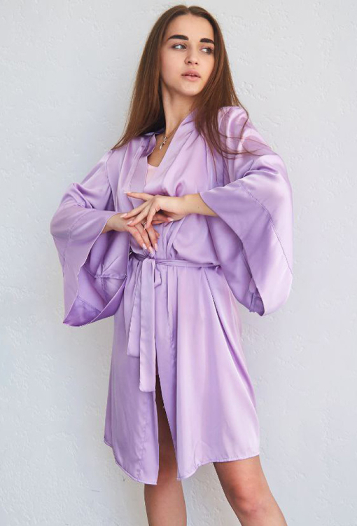 Стильный женский халат от украинского бренда Tomiko. Халат выполнен из мягкого и качественного шелка Армани светло-сиреневого цвета, свободного силуэта и длиной выше колен. Модель с широкими длинными рукавами, завязывается на запах с помощью пояса, рукава обработаны свободными манжетами. Халат очень красивый и приятный к телу, обеспечит комфорт и уют в любое время года, также может быть прекрасным подарком любимому и близкому человеку!