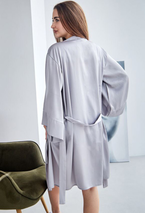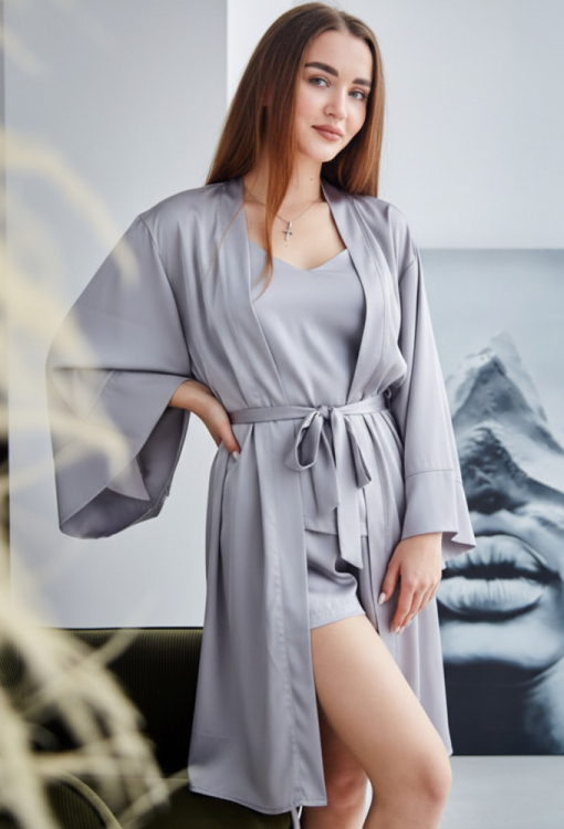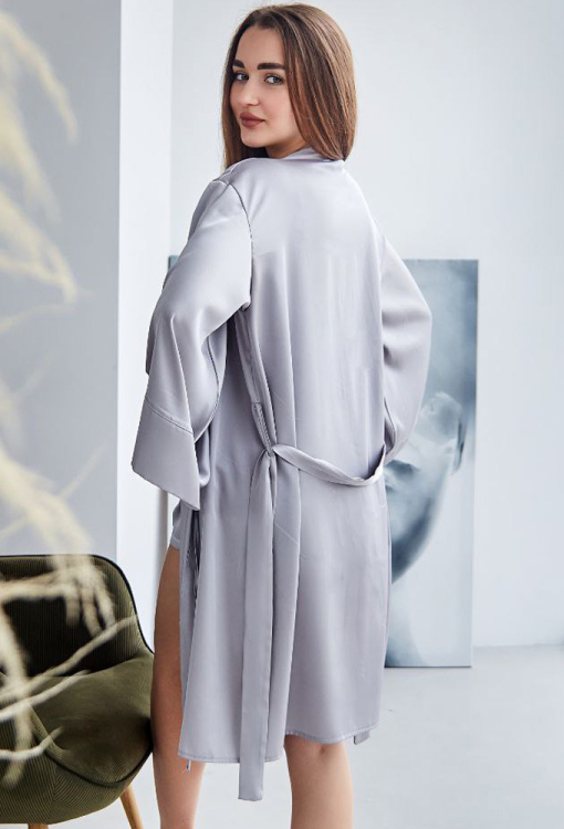 Стильный женский халат от украинского бренда Tomiko. Халат выполнен из мягкого и качественного шелка Армани серого цвета, свободного силуэта и длиной выше колен. Модель с широкими длинными рукавами, завязывается на запах с помощью пояса, рукава обработаны свободными манжетами. Халат очень красивый и приятный к телу, обеспечит комфорт и уют в любое время года, также может быть прекрасным подарком любимому и близкому человеку!