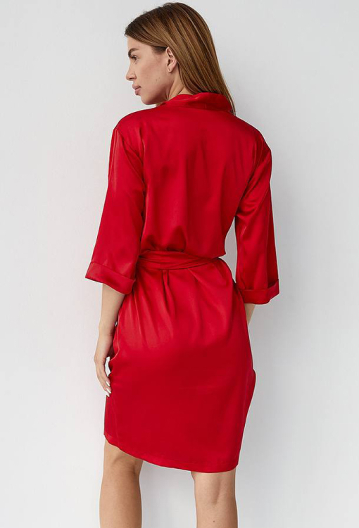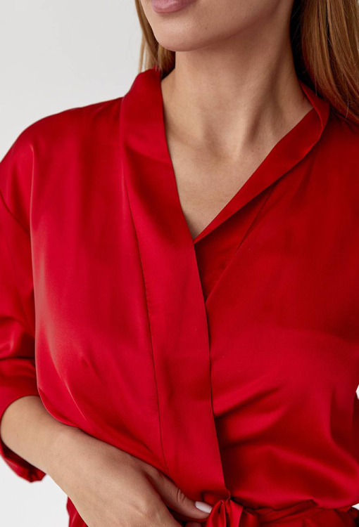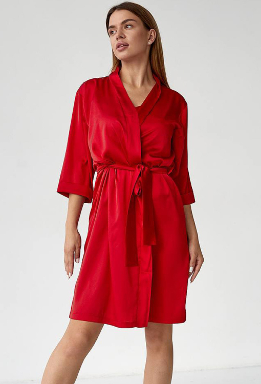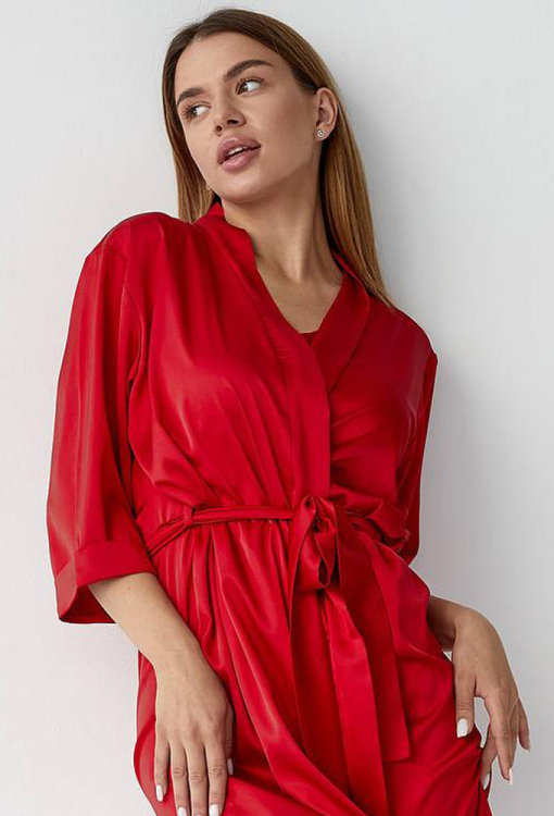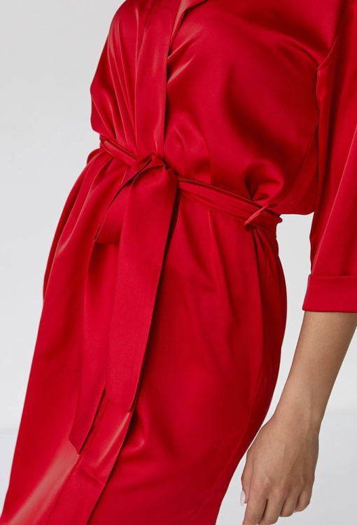 Яркий женский халат от украинского бренда V.Velika. Халат выполнен из мягкого и качественного шелка Армани красного цвета, свободного силуэта и длиной выше колен. Модель с рукавами 3/4 на отложных манжетах, завязывается на запах с помощью пояса, который фиксируется лямками по бокам. Халат очень красивый и комфортный, идеален для утреннего кофе и уютных домашних вечеров, также может быть замечательным подарком для любимого и близкого человека.