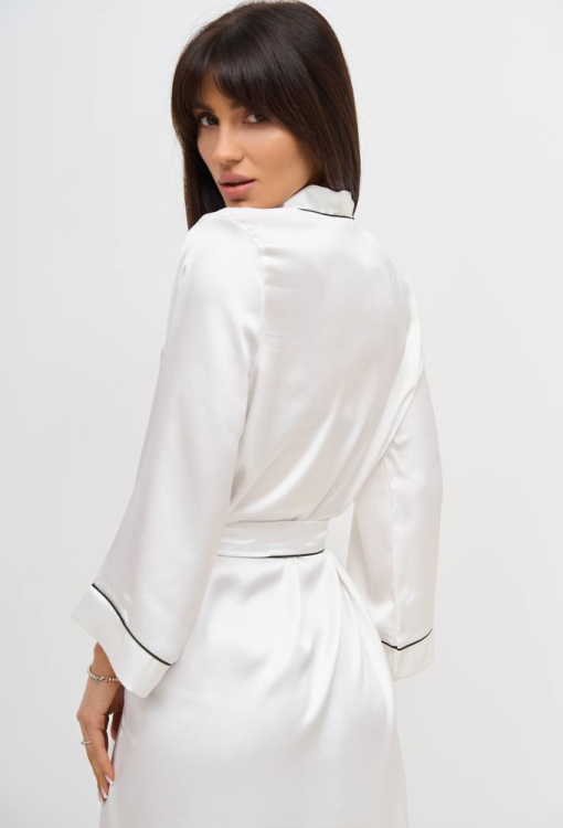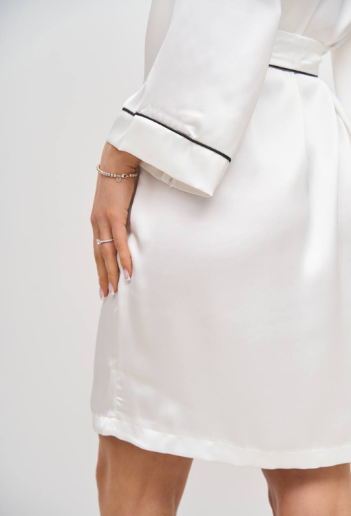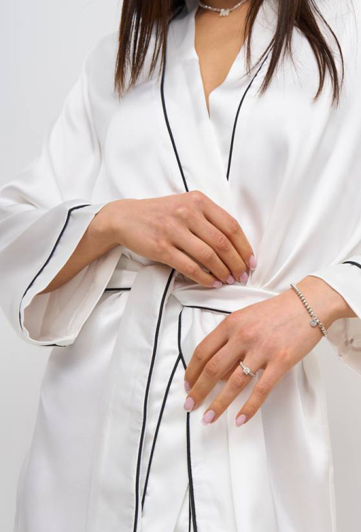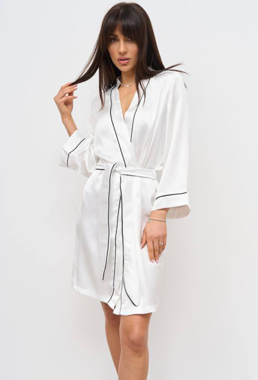 Легкий женский халат от украинского бренда V.Velika. Халат выполнен из мягкого и качественного шелка Армани кремового цвета, свободного силуэта и длиной выше колен. Модель с рукавами 7/8 на свободных манжетах, завязывается на запах с помощью пояса. Линия выреза, борта, рукава и пояс изделия украшены тонким кантом черного цвета. Халат очень красивый и комфортный, идеален для утреннего кофе и уютных домашних вечеров, также может быть замечательным подарком для любимого и близкого человека.