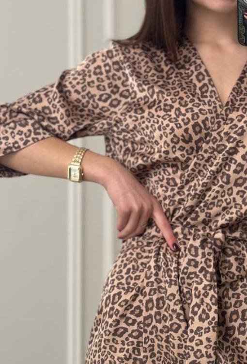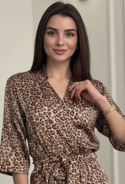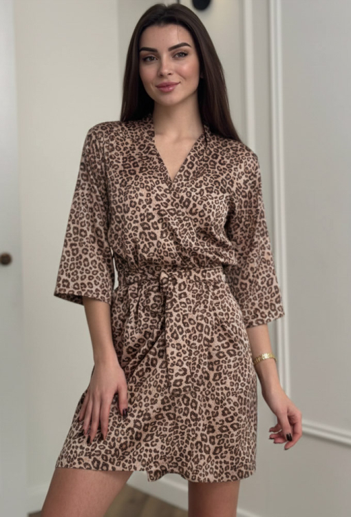 Эффектный женский халат от украинского бренда V.Velika. Халат выполнен из мягкого и качественного шелка Армани, бежевого цвета с коричневым леопардовым принтом, свободного силуэта и длиной выше колен. Модель с рукавами 3/4 завязывается на запах с помощью пояса, рукава обработаны свободными манжетами. Халат легкий и приятный к телу, подчеркнет привлекательность домашнего образа, также может быть замечательным подарком для любимого и близкого человека.