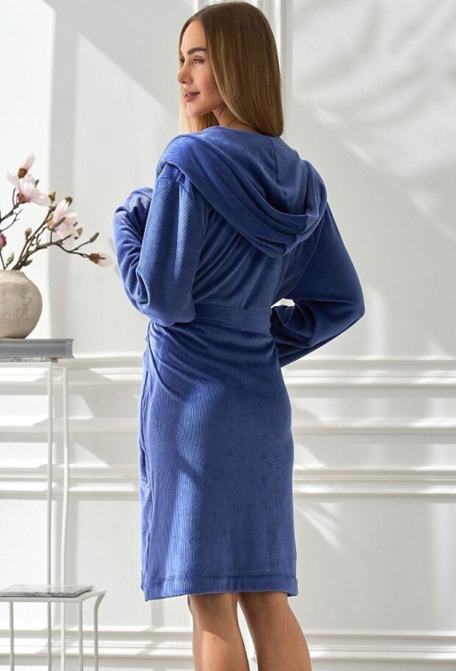 Стильный женский халат от польского бренда L&L. Халат выполнен из качественного, тонкого и мягкого трикотажа с фактурой в рубчик синего цвета, с длинными рукавами и капюшоном. Модель свободного силуэта и длиной выше колен, завязывается на запах с помощью пояса, по бокам расположены два удобных кармана. Халат очень красивый и комфортный, идеально подойдет для тихого утра, расслабленных вечеров и отдыха в выходные, а также может быть полезным подарком любимому и близкому человеку.