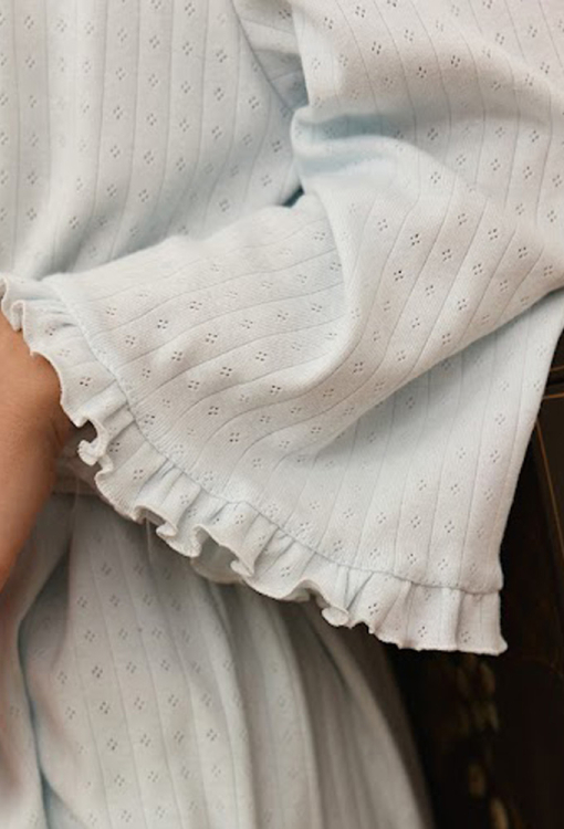 Привлекательный женский халат из коллекции Sandra от украинского бренда Your Touch. Халат выполнен из мягкого и качественного хлопкового трикотажа с ажурной фактурой голубого цвета, свободного силуэта и длиной выше колен. Модель с длинными, слегка расширенными, рукавами завязывается на запах с помощью пояса. Рукава изделия украшены очаровательными рюшами, низ обработан декоративным волнистым швом. Халат очень красивый и комфортный, идеален для домашнего уюта, а также может быть полезным подарком любимому и близкому человеку.