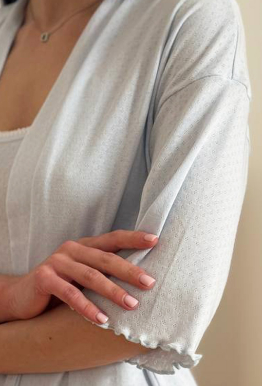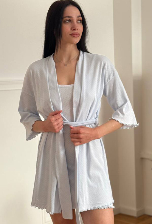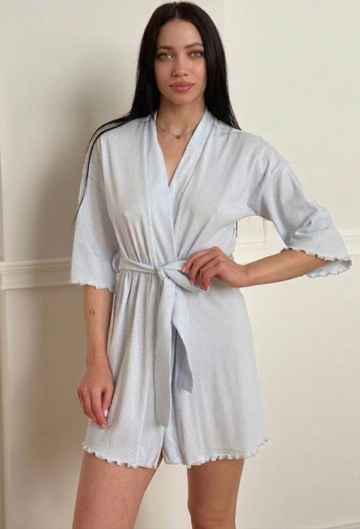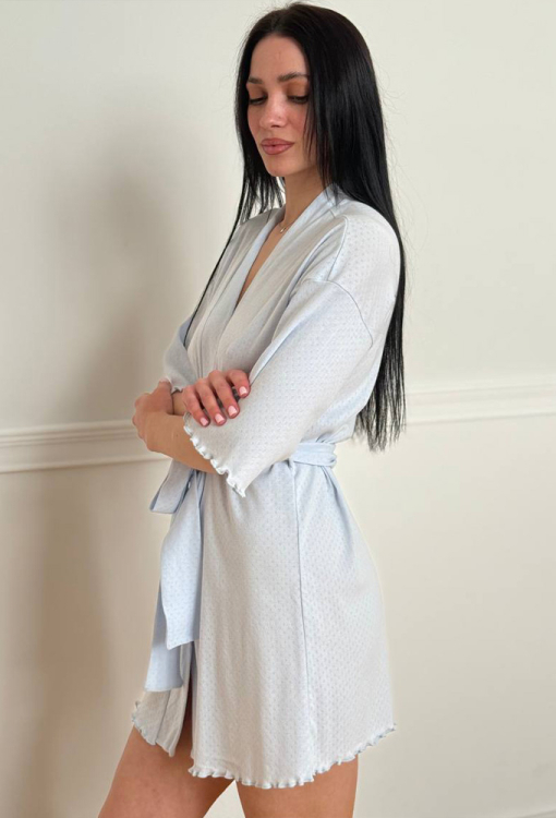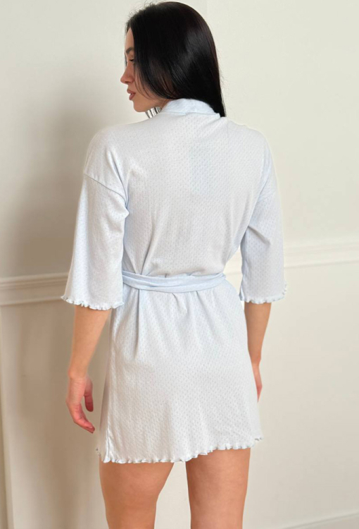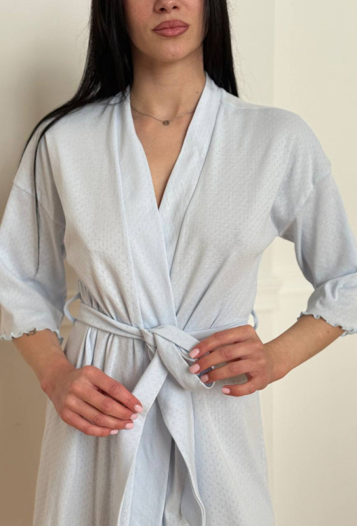 Стильный женский халат от украинского бренда V.Velika. Халат выполнен из мягкого и качественного хлопкового трикотажа с ажурной фактурой в виде маленьких ромбиков голубого цвета, свободного силуэта и длиной мини. Модель с рукавами 3/4 и заниженным плечевым швом, завязывается на запах с помощью пояса. Рукава и низ изделия украшены волнистой отделкой. Халат легкий и приятный к телу, подчеркнет привлекательность домашнего образа, также может быть замечательным подарком для любимого и близкого человека.