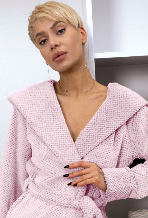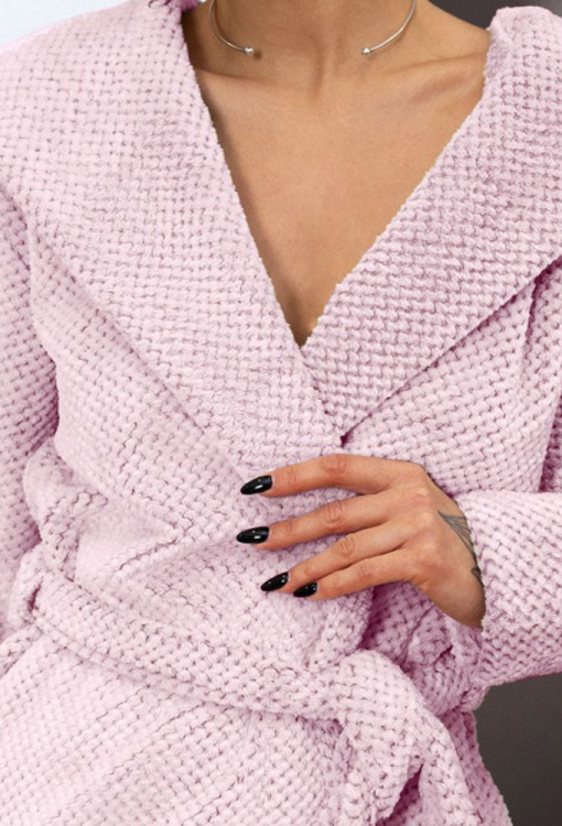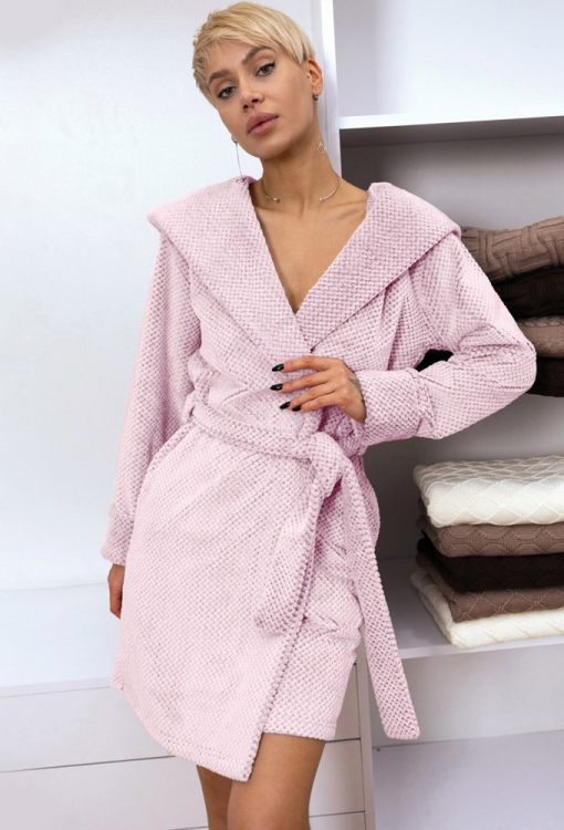 Стильный женский халат из коллекции Assorty от украинского бренда Leinle. Халат выполнен из мягкого и качественного велсофта с тисненной фактурой розового цвета, с длинными рукавами и капюшоном. Модель длиной выше колен и с удобными боковыми карманами, завязывается на запах с помощью пояса, рукава обработаны отложными манжетами. Халат очень красивый и комфортный, станет незаменимым предметом домашнего гардероба в холодные дни, а также может быть замечательным подарком любимому или близкому человеку.