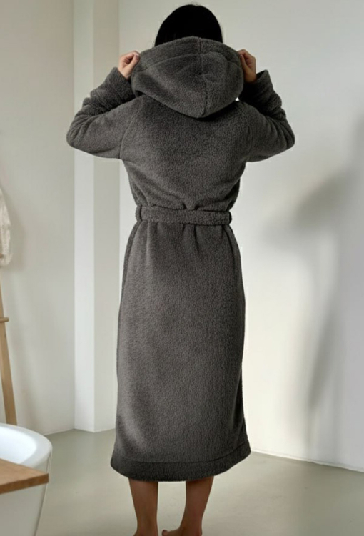 Теплый женский халат Cuddle от украинского бренда Cosy. Халат выполнен из качественного и мягкого велсофта темно-серого цвета, с капюшоном и длиной ниже колен. Модель с длинными рукавами и удобными боковыми карманами, завязывается на запах с помощью пояса. Длину рукава изделия можно отрегулировать за счет отложных манжет. Халат очень красивый и комфортный, идеален для вечернего отдыха или утренних часов дома, а также может быть полезным подарком любимому и близкому человеку.