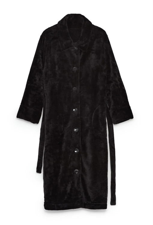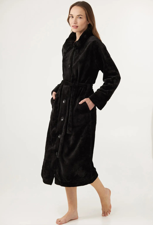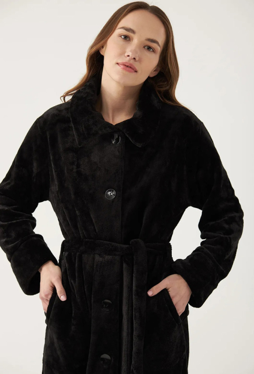 Теплый женский халат из коллекции Margo от украинского бренда Ellen. Халат выполнен из качественного и мягкого велсофта черного цвета, свободного силуэта и длиной ниже колен. Модель с длинными рукавами и классическим воротником, застегивается на пуговицы и дополнительно фиксируется поясом, позволяя регулировать посадку. По бокам изделие обработано удобными карманами, рукава - свободными манжетами. Халат невероятно красивый и комфортный, идеально подходит для повседневного домашнего пользования, а также станет полезным и приятным подарком для любимого или близкого человека.